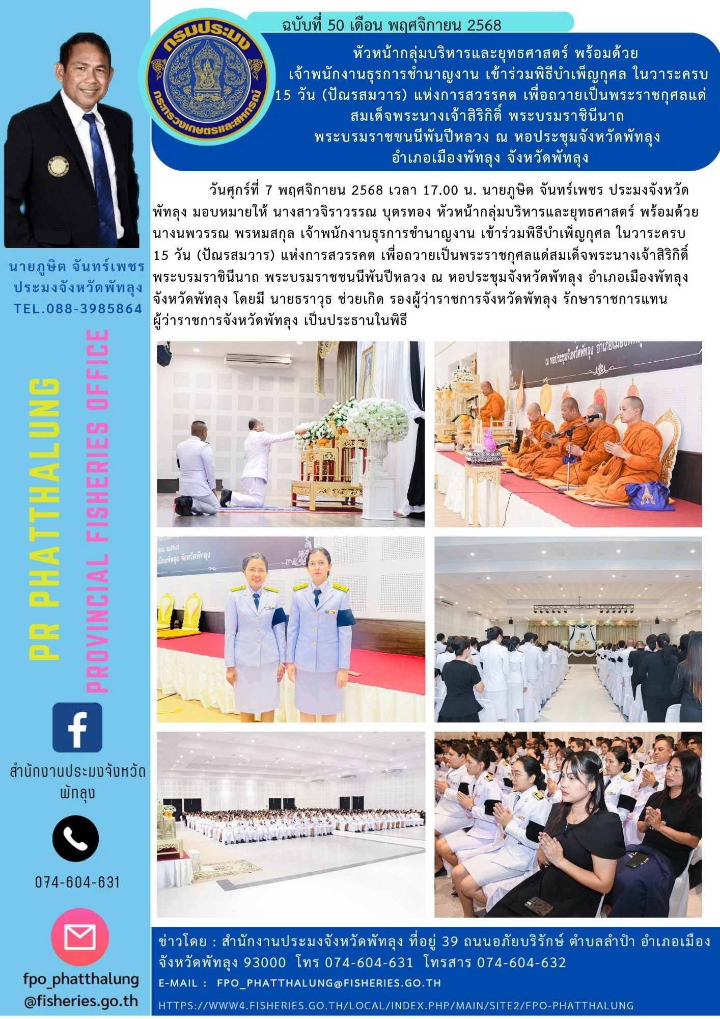 วันศุกร์ที่ 7 พฤศจิกายน 2568 เวลา 17.00 น. นายภูษิต จันทร์เพชร ประมงจังหวัดพัทลุง มอบหมายให้ นางสาวจิราวรรณ บุตรทอง หัวหน้ากลุ่มบริหารและยุทธศาสตร์ พร้อมด้วยนางนพวรรณ พรหมสกุล เจ้าพนักงานธุรการชำนาญงาน เข้าร่วมพิธีบำเพ็ญกุศล ในวาระครบ 15 วัน (ปัณรสมวาร) แห่งการสวรรคต เพื่อถวายเป็นพระราชกุศลแด่สมเด็จพระนางเจ้าสิริกิติ์ พระบรมราชินีนาถ พระบรมราชชนนีพันปีหลวง ณ หอประชุมจังหวัดพัทลุง อำเภอเมืองพัทลุง จังหวัดพัทลุง โดยมี นายธราวุธ ช่วยเกิด รองผู้ว่าราชการจังหวัดพัทลุง รักษาราชการแทน ผู้ว่าราชการจังหวัดพัทลุง เป็นประธานในพิธี