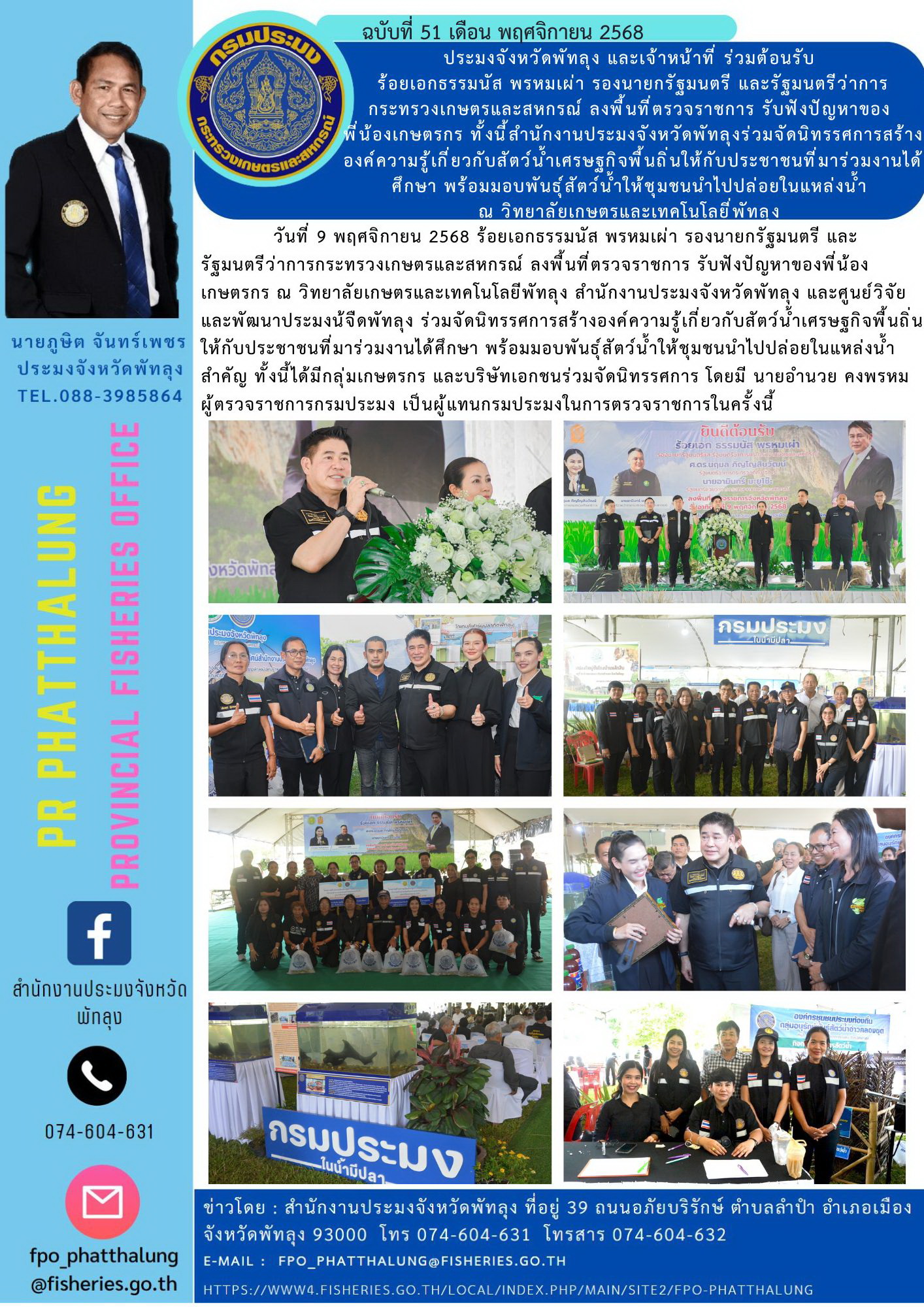 วันที่ 9 พฤศจิกายน 2568 ร้อยเอกธรรมนัส พรหมเผ่า รองนายกรัฐมนตรี และรัฐมนตรีว่าการกระทรวงเกษตรและสหกรณ์ ลงพื้นที่ตรวจราชการ รับฟังปัญหาของพี่น้องเกษตรกร ณ วิทยาลัยเกษตรและเทคโนโลยีพัทลุง สำนักงานประมงจังหวัดพัทลุง และศูนย์วิจัยและพัฒนาประมงน้จืดพัทลุง ร่วมจัดนิทรรศการสร้างองค์ความรู้เกี่ยวกับสัตว์น้ำเศรษฐกิจพื้นถิ่นให้กับประชาชนที่มาร่วมงานได้ศึกษา พร้อมมอบพันธุ์สัตว์น้ำให้ชุมชนนำไปปล่อยในแหล่งน้ำสำคัญ ทั้งนี้ได้มีกลุ่มเกษตรกร และบริษัทเอกชนร่วมจัดนิทรรศการ โดยมี นายอำนวย คงพรหม ผู้ตรวจราชการกรมประมง เป็นผู้แทนกรมประมงในการตรวจราชการในครั้งนี้