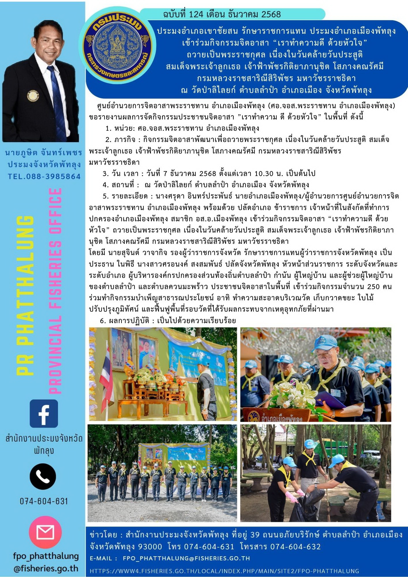 ประมงอำเภอเขาชัยสน รักษาราชการแทน ประมงอำเภอเมืองพัทลุง เข้าร่วมกิจกรรมจิตอาสา “เราทำความดี ด้วยหัวใจ” ถวายเป็นพระราชกุศล เนื่องในวันคล้ายวันประสูติ สมเด็จพระเจ้าลูกเธอ เจ้าฟ้าพัชรกิติยาภานุชิต โสภางคณรัศมี กรมหลวงราชสาริณีสิริพัชร มหาวัชรราชธิดา ณ วัดป่าลิไลยก์ ตำบลลำปำ อำเภอเมือง จังหวัดพัทลุง