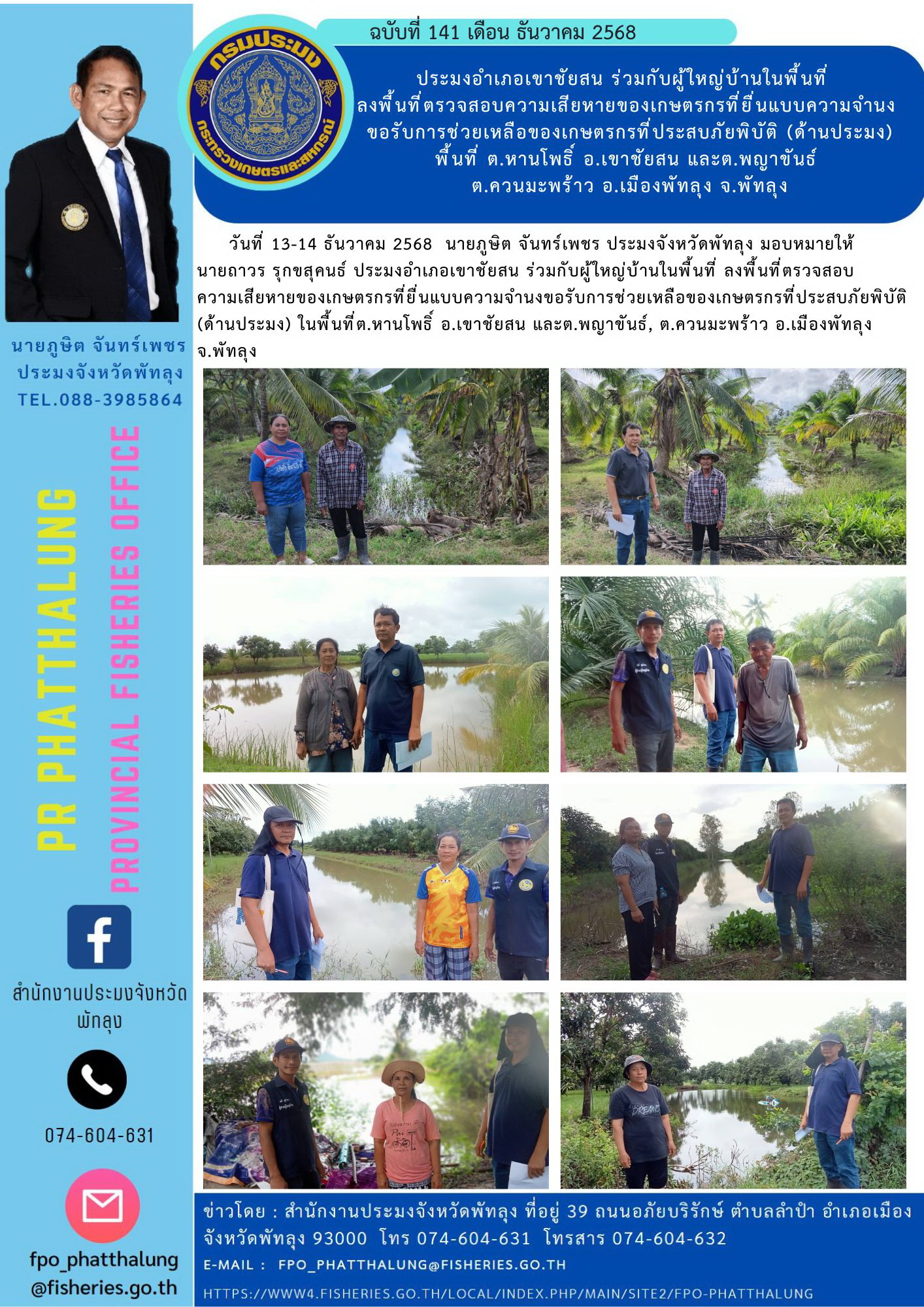 วันที่ 13-14 ธันวาคม 2568 นายภูษิต จันทร์เพชร ประมงจังหวัดพัทลุง มอบหมายให้ นายถาวร รุกขสุคนธ์ ประมงอำเภอเขาชัยสน ร่วมกับผู้ใหญ่บ้านในพื้นที่ ลงพื้นที่ตรวจสอบความเสียหายของเกษตรกรที่ยื่นแบบความจำนงขอรับการช่วยเหลือของเกษตรกรที่ประสบภัยพิบัติ (ด้านประมง) ในพื้นที่ต.หานโพธิ์ อ.เขาชัยสน และต.พญาขันธ์, ต.ควนมะพร้าว อ.เมืองพัทลุง จ.พัทลุง