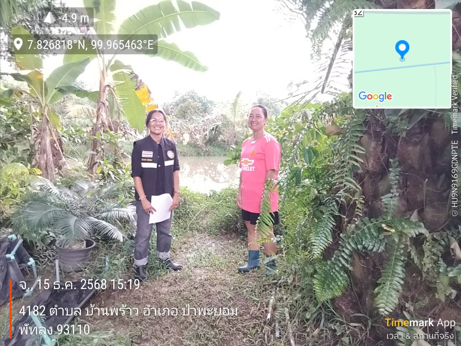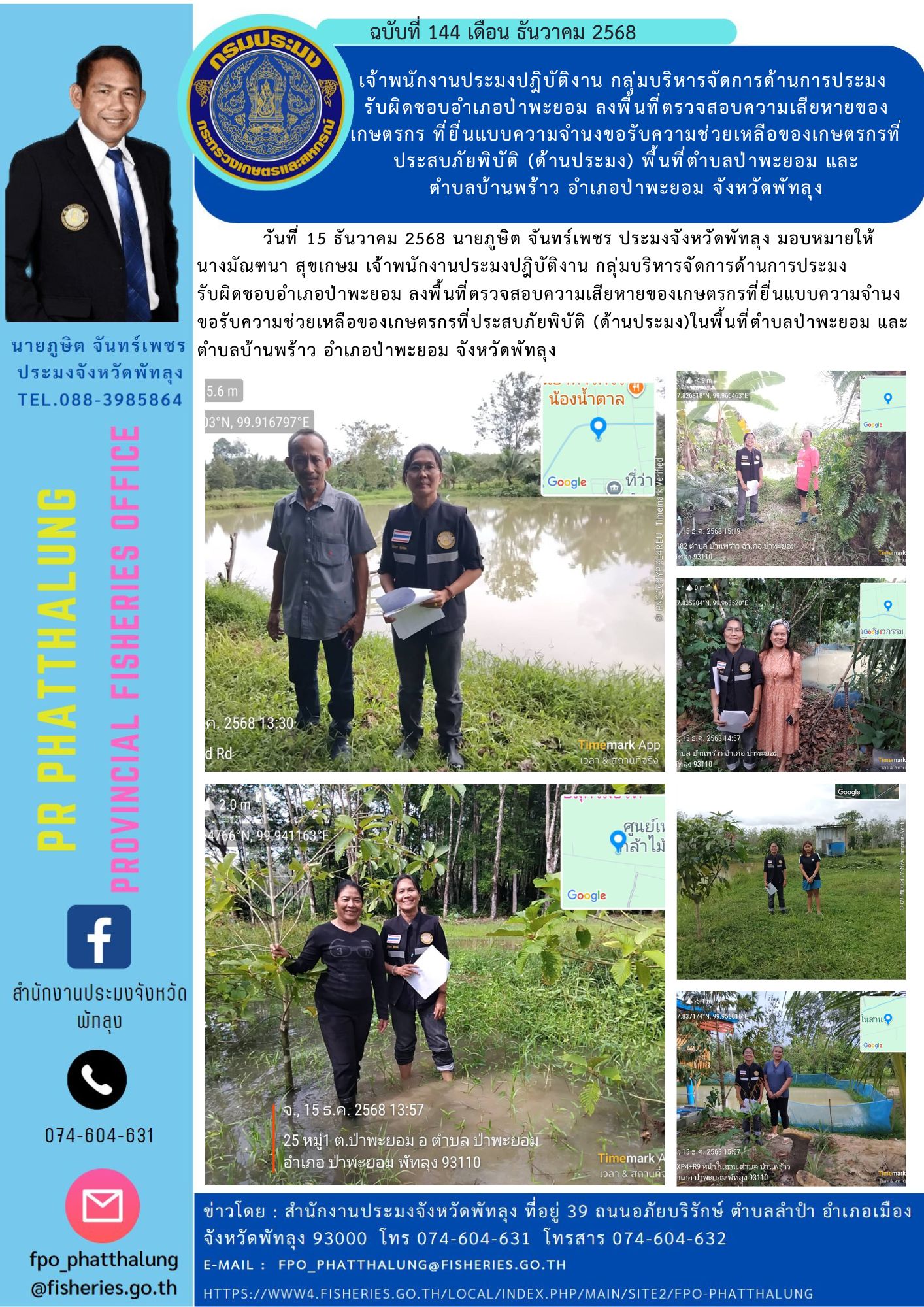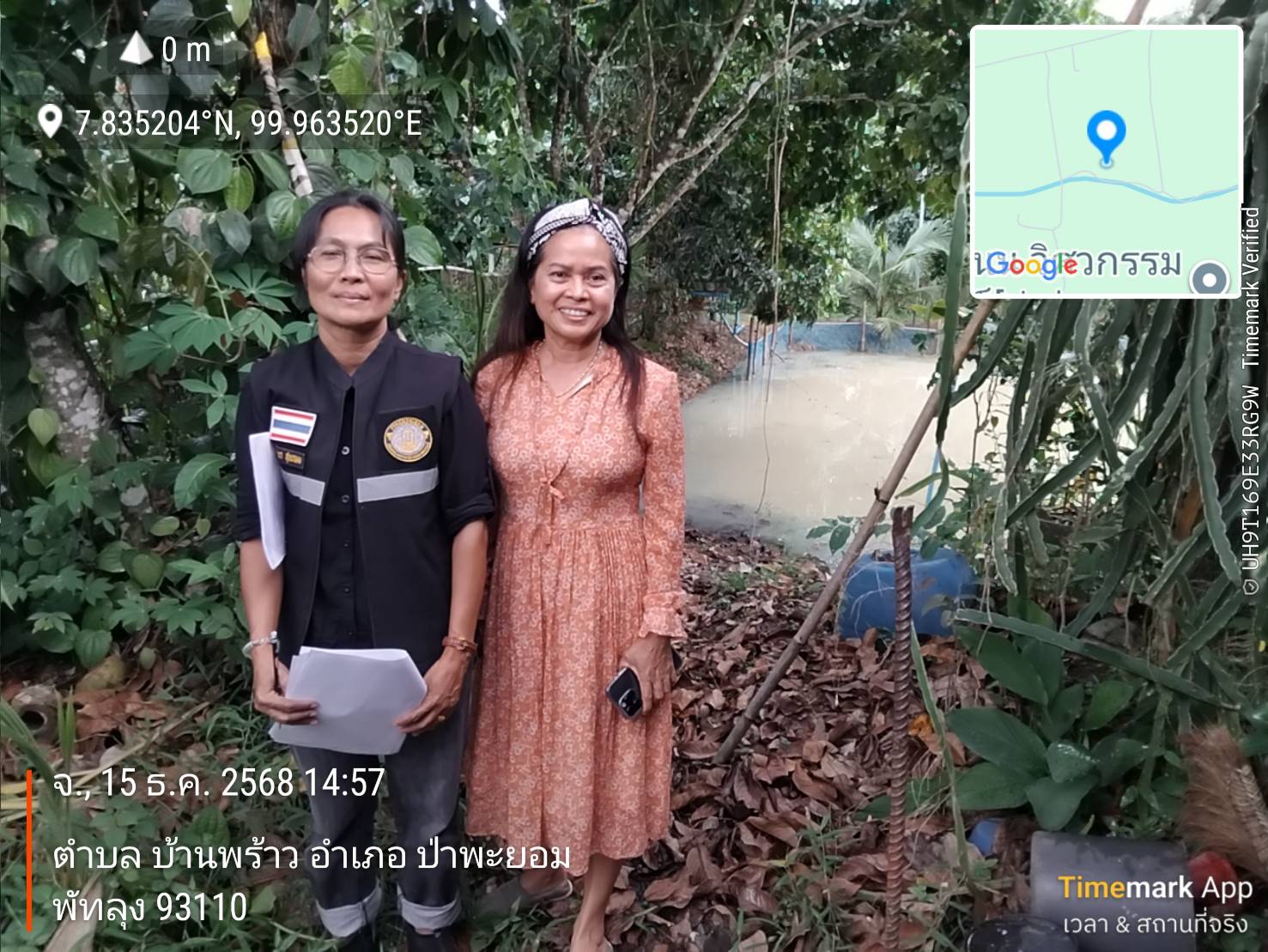วันที่ 15 ธันวาคม 2568 นายภูษิต จันทร์เพชร ประมงจังหวัดพัทลุง มอบหมายให้ นางมัณฑนา สุขเกษม เจ้าพนักงานประมงปฎิบัติงาน กลุ่มบริหารจัดการด้านการประมง รับผิดชอบอำเภอป่าพะยอม ลงพื้นที่ตรวจสอบความเสียหายของเกษตรกรที่ยื่นแบบความจำนงขอรับความช่วยเหลือของเกษตรกรที่ประสบภัยพิบัติ (ด้านประมง)ในพื้นที่ตำบลป่าพะยอม และตำบลบ้านพร้าว อำเภอป่าพะยอม จังหวัดพัทลุง