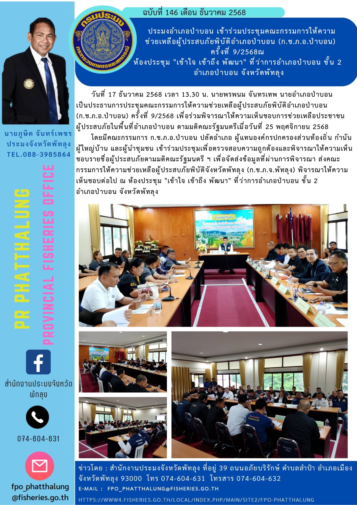 วันที่ 17 ธันวาคม 2568 เวลา 13.30 น. นายพรพนม จันทรเทพ นายอำเภอป่าบอน เป็นประธานการประชุมคณะกรรมการให้ความช่วยเหลือผู้ประสบภัยพิบัติอำเภอป่าบอน (ก.ช.ภ.อ.ป่าบอน) ครั้งที่ 9/2568 เพื่อร่วมพิจารณาให้ความเห็นชอบการช่วยเหลือประชาชน ผู้ประสบภัยในพื้นที่อำเภอป่าบอน ตามมติคณะรัฐมนตรีเมื่อวันที่ 25 พฤศจิกายน 2568โดยมีคณะกรรมการ ก.ช.ภ.อ.ป่าบอน ปลัดอำเภอ ผู้แทนองค์กรปกครองส่วนท้องถิ่น กำนัน ผู้ใหญ่บ้าน และผู้นำชุมชน เข้าร่วมประชุมเพื่อตรวจสอบความถูกต้องและพิจารณาให้ความเห็นชอบรายชื่อผู้ประสบภัยตามมติคณะรัฐมนตรี ฯ เพื่อจัดส่งข้อมูลที่ผ่านการพิจารณา ส่งคณะกรรมการให้ความช่วยเหลือผู้ประสบภัยพิบัติจังหวัดพัทลุง (ก.ช.ภ.จ.พัทลุง) พิจารณาให้ความเห็นชอบต่อไป ณ ห้องประชุม "เข้าใจ เข้าถึง พัฒนา" ที่ว่าการอำเภอป่าบอน ชั้น 2 อำเภอป่าบอน จังหวัดพัทลุง