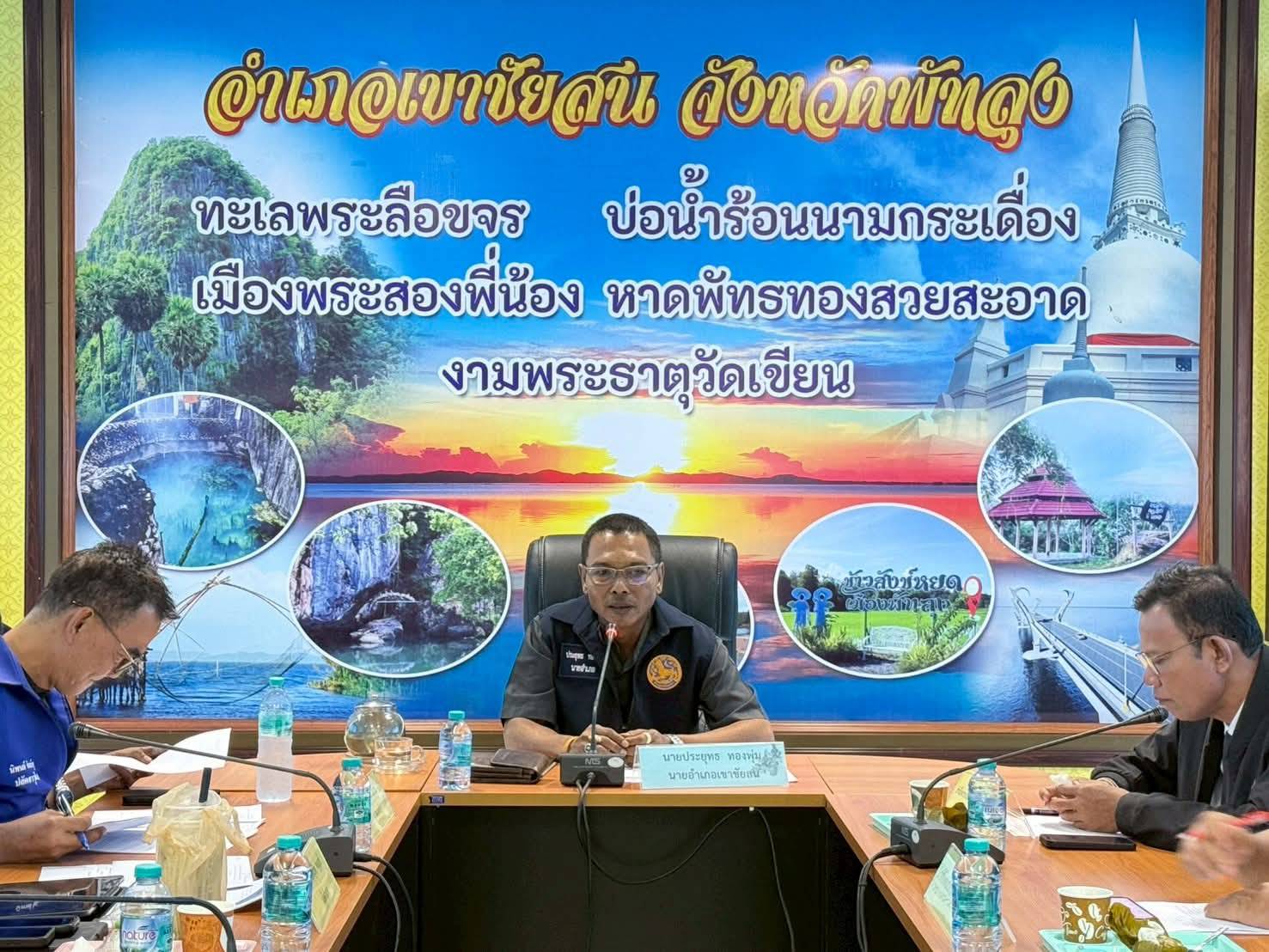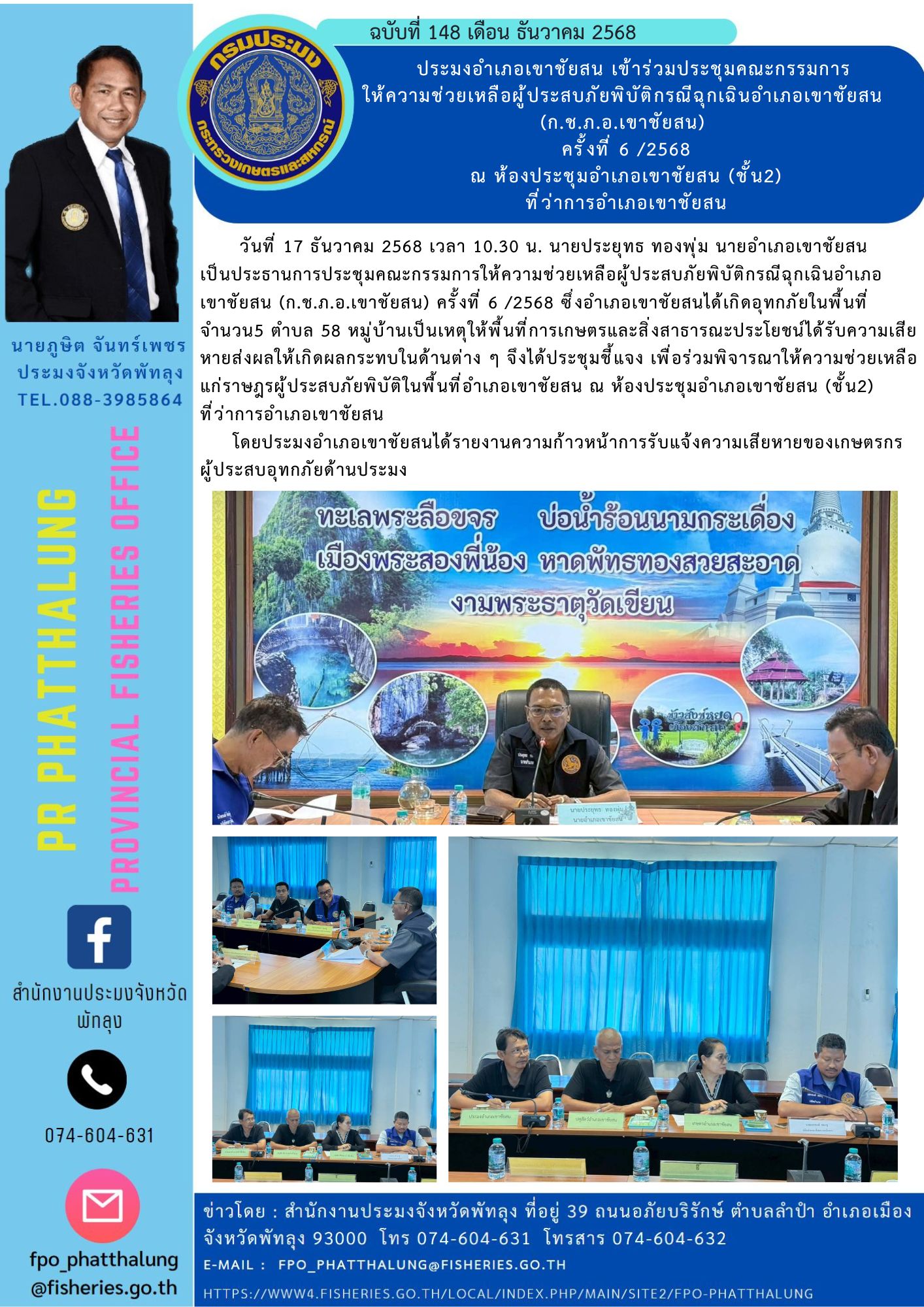 วันที่ 17 ธันวาคม 2568 เวลา 10.30 น. นายประยุทธ ทองพุ่ม นายอำเภอเขาชัยสน เป็นประธานการประชุมคณะกรรมการให้ความช่วยเหลือผู้ประสบภัยพิบัติกรณีฉุกเฉินอำเภอเขาชัยสน (ก.ช.ภ.อ.เขาชัยสน) ครั้งที่ 6 /2568 ซึ่งอำเภอเขาชัยสนได้เกิดอุทกภัยในพื้นที่ จำนวน5 ตำบล 58 หมู่บ้านเป็นเหตุให้พื้นที่การเกษตรและสิ่งสาธารณะประโยชน์ได้รับความเสียหายส่งผลให้เกิดผลกระทบในด้านต่าง ๆ จึงได้ประชุมชี้แจง เพื่อร่วมพิจารณาให้ความช่วยเหลือแก่ราษฎรผู้ประสบภัยพิบัติในพื้นที่อำเภอเขาชัยสน ณ ห้องประชุมอำเภอเขาชัยสน (ชั้น2) ที่ว่าการอำเภอเขาชัยสน โดยประมงอำเภอเขาชัยสนได้รายงานความก้าวหน้าการรับแจ้งความเสียหายของเกษตรกรผู้ประสบอุทกภัยด้านประมง