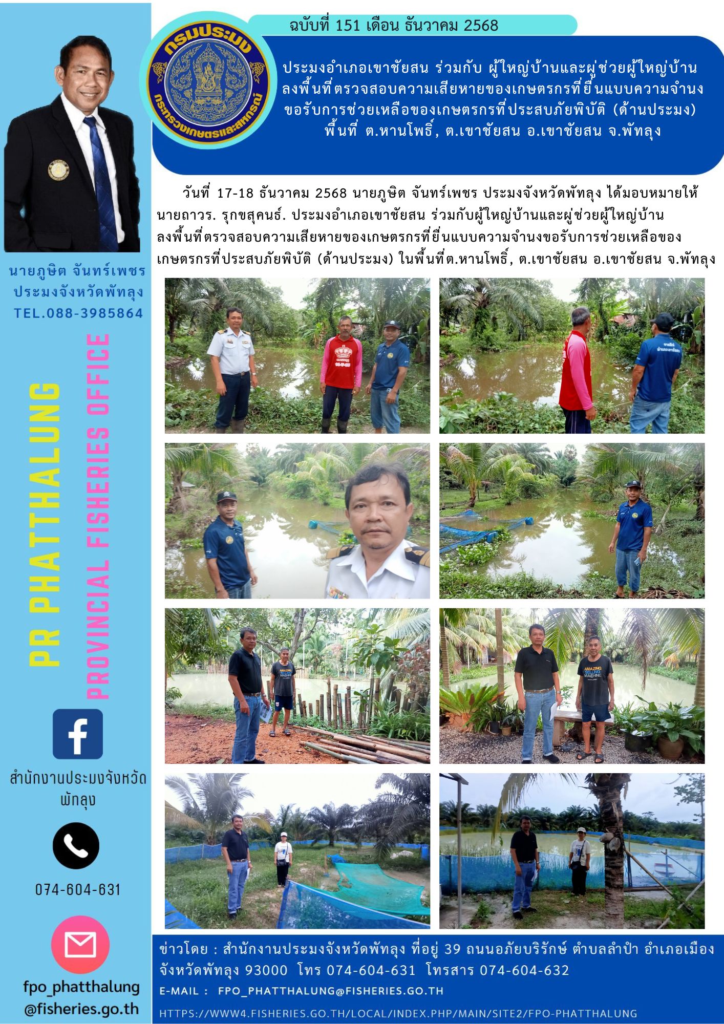 วันที่ 17-18 ธันวาคม 2568 นายภูษิต จันทร์เพชร ประมงจังหวัดพัทลุง ได้มอบหมายให้ นายถาวร. รุกขสุคนธ์. ประมงอำเภอเขาชัยสน ร่วมกับผู้ใหญ่บ้านและผู่ช่วยผู้ใหญ่บ้าน ลงพื้นที่ตรวจสอบความเสียหายของเกษตรกรที่ยื่นแบบความจำนงขอรับการช่วยเหลือของเกษตรกรที่ประสบภัยพิบัติ (ด้านประมง) ในพื้นที่ต.หานโพธิ์, ต.เขาชัยสน อ.เขาชัยสน จ.พัทลุง
