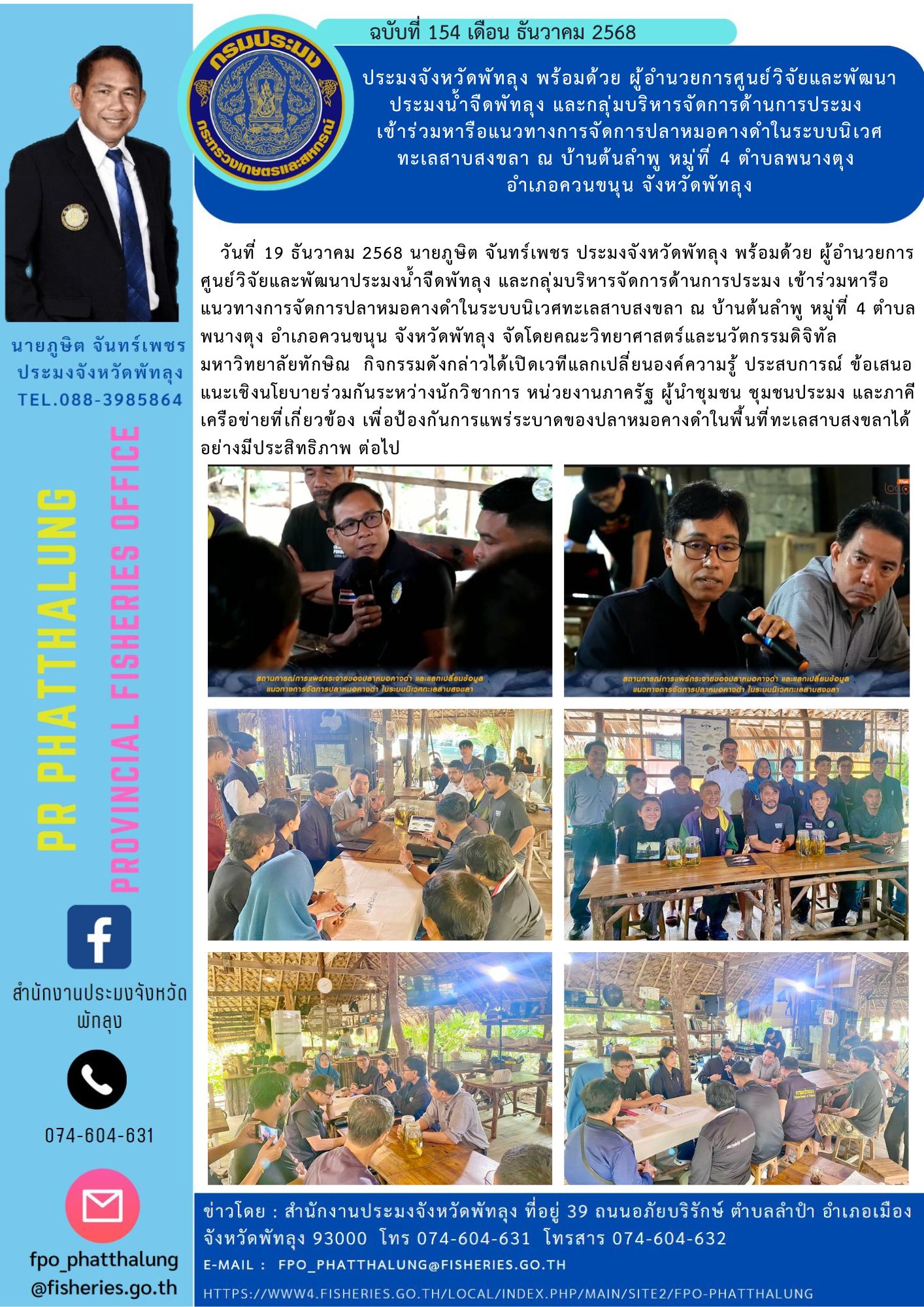 วันที่ 19 ธันวาคม 2568 นายภูษิต จันทร์เพชร ประมงจังหวัดพัทลุง พร้อมด้วย ผู้อำนวยการศูนย์วิจัยและพัฒนาประมงน้ำจืดพัทลุง และกลุ่มบริหารจัดการด้านการประมง เข้าร่วมหารือแนวทางการจัดการปลาหมอคางดำในระบบนิเวศทะเลสาบสงขลา ณ บ้านต้นลำพู หมู่ที่ 4 ตำบลพนางตุง อำเภอควนขนุน จังหวัดพัทลุง จัดโดยคณะวิทยาศาสตร์และนวัตกรรมดิจิทัล มหาวิทยาลัยทักษิณ กิจกรรมดังกล่าวได้เปิดเวทีแลกเปลี่ยนองค์ความรู้ ประสบการณ์ ข้อเสนอแนะเชิงนโยบายร่วมกันระหว่างนักวิชาการ หน่วยงานภาครัฐ ผู้นำชุมชน ชุมชนประมง และภาคีเครือข่ายที่เกี่ยวข้อง เพื่อป้องกันการแพร่ระบาดของปลาหมอคางดำในพื้นที่ทะเลสาบสงขลาได้อย่างมีประสิทธิภาพ ต่อไป