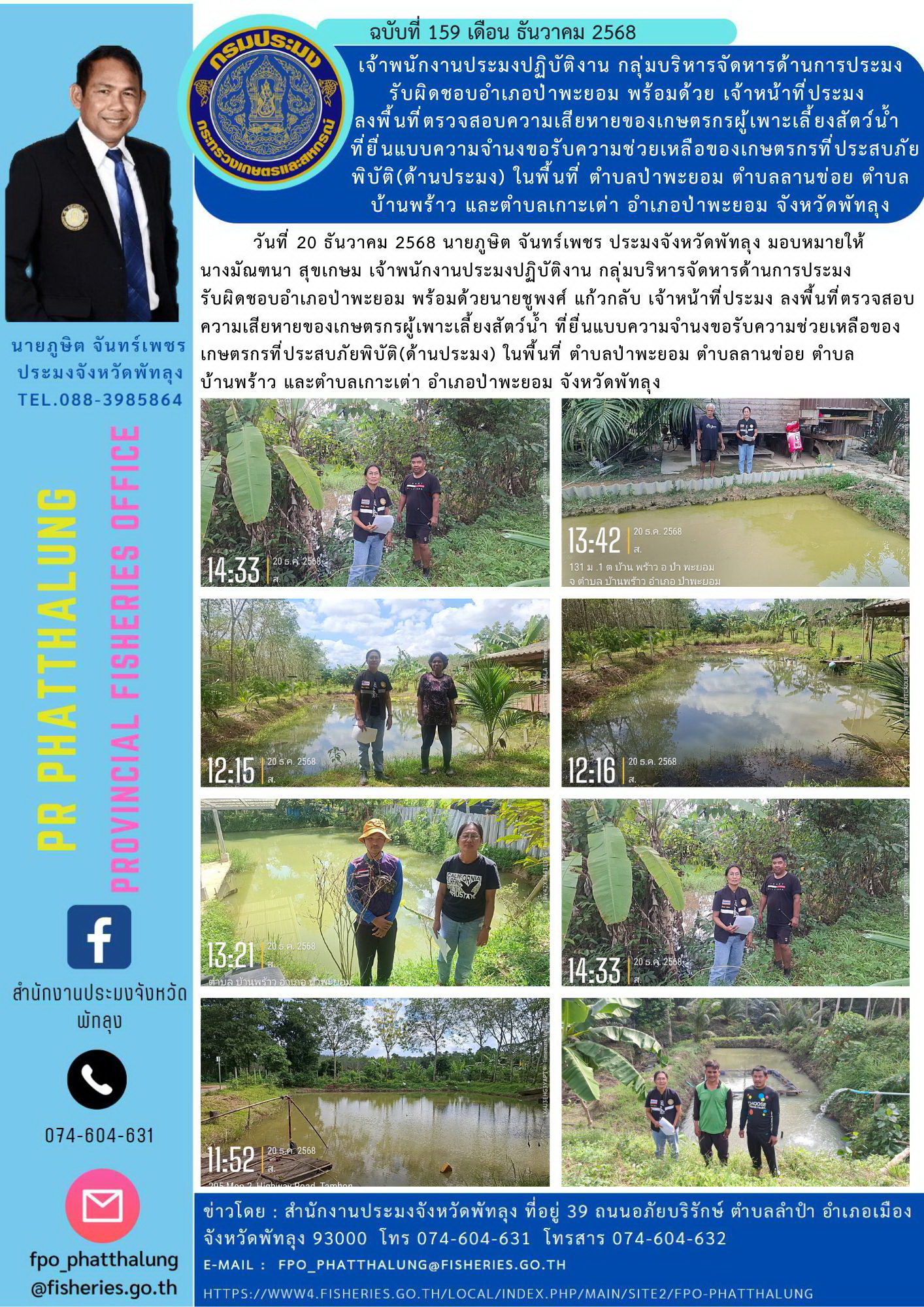 วันที่ 20 ธันวาคม 2568 นายภูษิต จันทร์เพชร ประมงจังหวัดพัทลุง มอบหมายให้ นางมัณฑนา สุขเกษม เจ้าพนักงานประมงปฏิบัติงาน กลุ่มบริหารจัดหารด้านการประมง รับผิดชอบอำเภอป่าพะยอม พร้อมด้วยนายชูพงศ์ แก้วกลับ เจ้าหน้าที่ประมง ลงพื้นที่ตรวจสอบความเสียหายของเกษตรกรผู้เพาะเลี้ยงสัตว์น้ำ ที่ยื่นแบบความจำนงขอรับความช่วยเหลือของเกษตรกรที่ประสบภัยพิบัติ(ด้านประมง) ในพื้นที่ ตำบลป่าพะยอม ตำบลลานข่อย ตำบลบ้านพร้าว และตำบลเกาะเต่า อำเภอป่าพะยอม จังหวัดพัทลุง