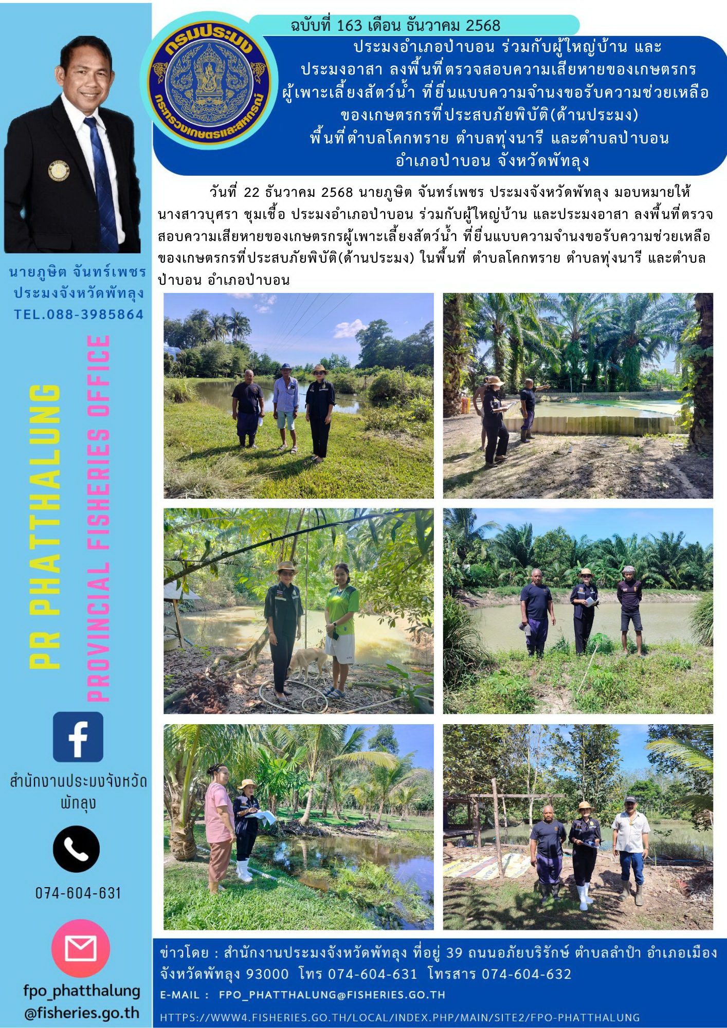 วันที่ 22 ธันวาคม 2568 นายภูษิต จันทร์เพชร ประมงจังหวัดพัทลุง มอบหมายให้นางสาวบุศรา ชุมเชื้อ ประมงอำเภอป่าบอน ร่วมกับผู้ใหญ่บ้าน และประมงอาสา ลงพื้นที่ตรวจสอบความเสียหายของเกษตรกรผู้เพาะเลี้ยงสัตว์น้ำ ที่ยื่นแบบความจำนงขอรับความช่วยเหลือของเกษตรกรที่ประสบภัยพิบัติ(ด้านประมง) ในพื้นที่ ตำบลโคกทราย ตำบลทุ่งนารี และตำบลป่าบอน อำเภอป่าบอน