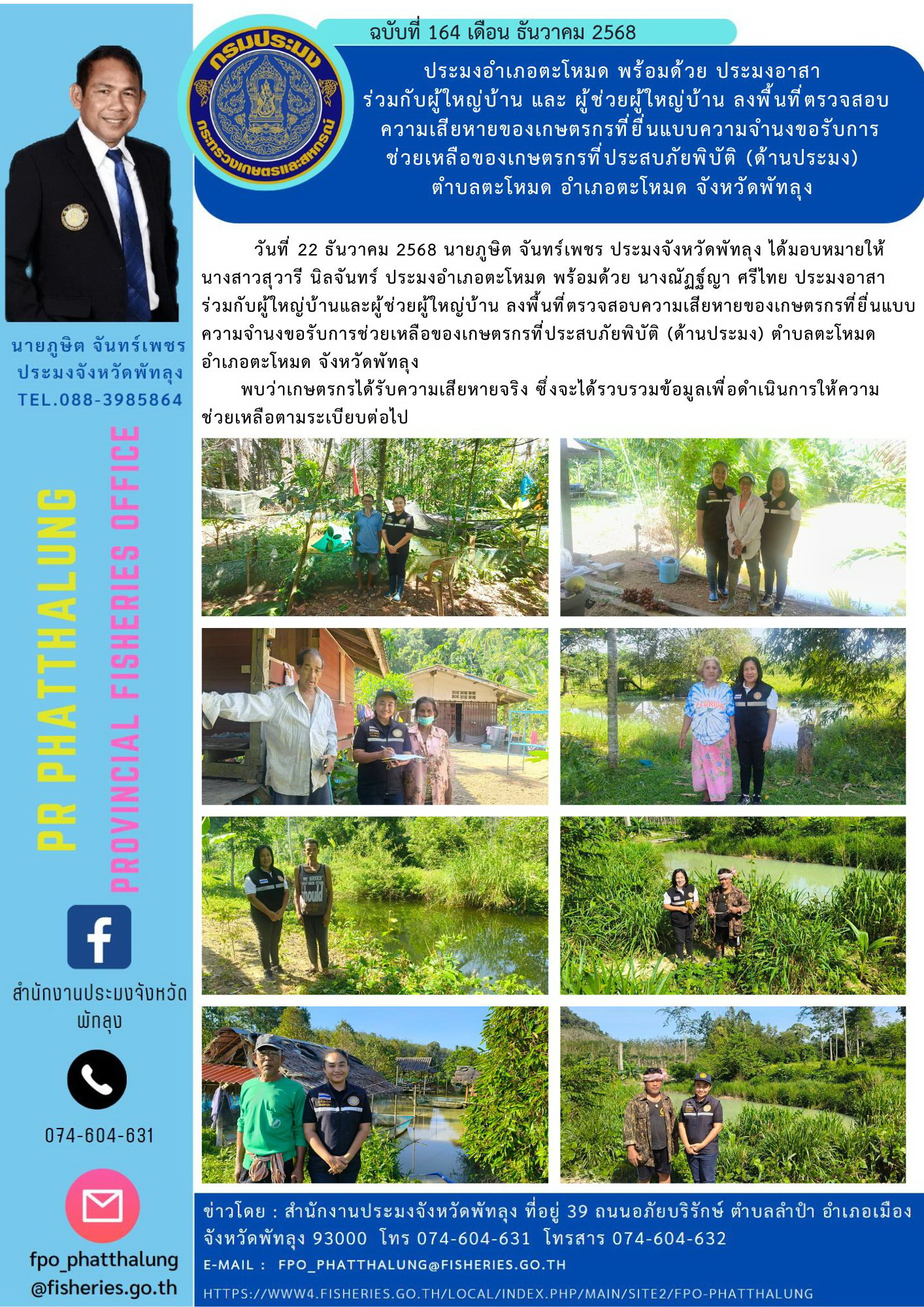 วันที่ 22 ธันวาคม 2568 นายภูษิต จันทร์เพชร ประมงจังหวัดพัทลุง ได้มอบหมายให้นางสาวสุวารี นิลจันทร์ ประมงอำเภอตะโหมด พร้อมด้วย นางณัฏฐ์ญา ศรีไทย ประมงอาสาร่วมกับผู้ใหญ่บ้านและผู้ช่วยผู้ใหญ่บ้าน ลงพื้นที่ตรวจสอบความเสียหายของเกษตรกรที่ยื่นแบบความจำนงขอรับการช่วยเหลือของเกษตรกรที่ประสบภัยพิบัติ (ด้านประมง) ตำบลตะโหมดอำเภอตะโหมด จังหวัดพัทลุง พบว่าเกษตรกรได้รับความเสียหายจริง ซึ่งจะได้รวบรวมข้อมูลเพื่อดำเนินการให้ความ ช่วยเหลือตามระเบียบต่อไป