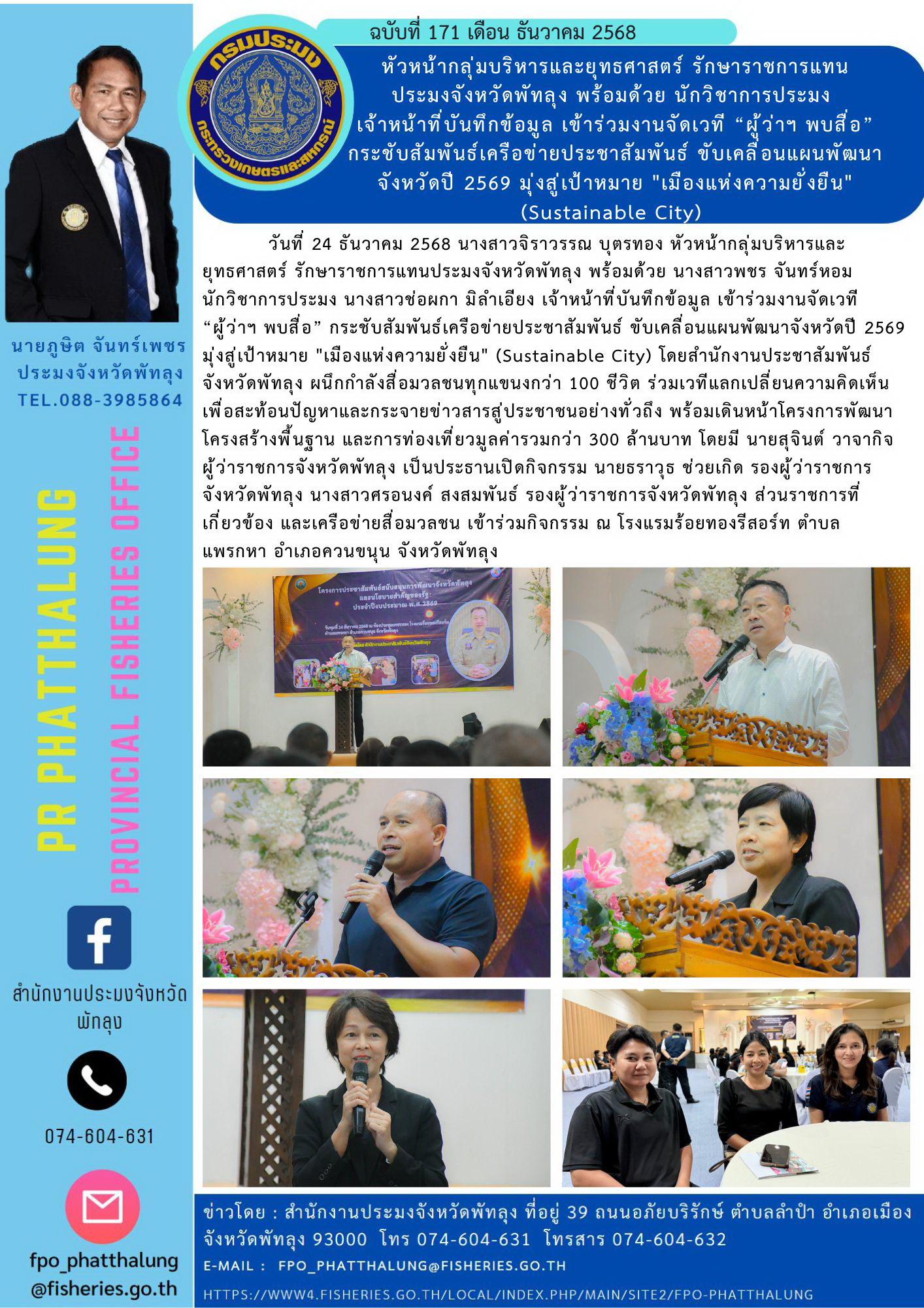 หัวหน้ากลุ่มบริหารและยุทธศาสตร์ รักษาราชการแทน ประมงจังหวัดพัทลุง พร้อมด้วย นักวิชาการประมง เจ้าหน้าที่บันทึกข้อมูล เข้าร่วมงานจัดเวที “ผู้ว่าฯ พบสื่อ” กระชับสัมพันธ์เครือข่ายประชาสัมพันธ์ ขับเคลื่อนแผนพัฒนาจังหวัดปี 2569 มุ่งสู่เป้าหมาย "เมืองแห่งความยั่งยืน" (Sustainable City)