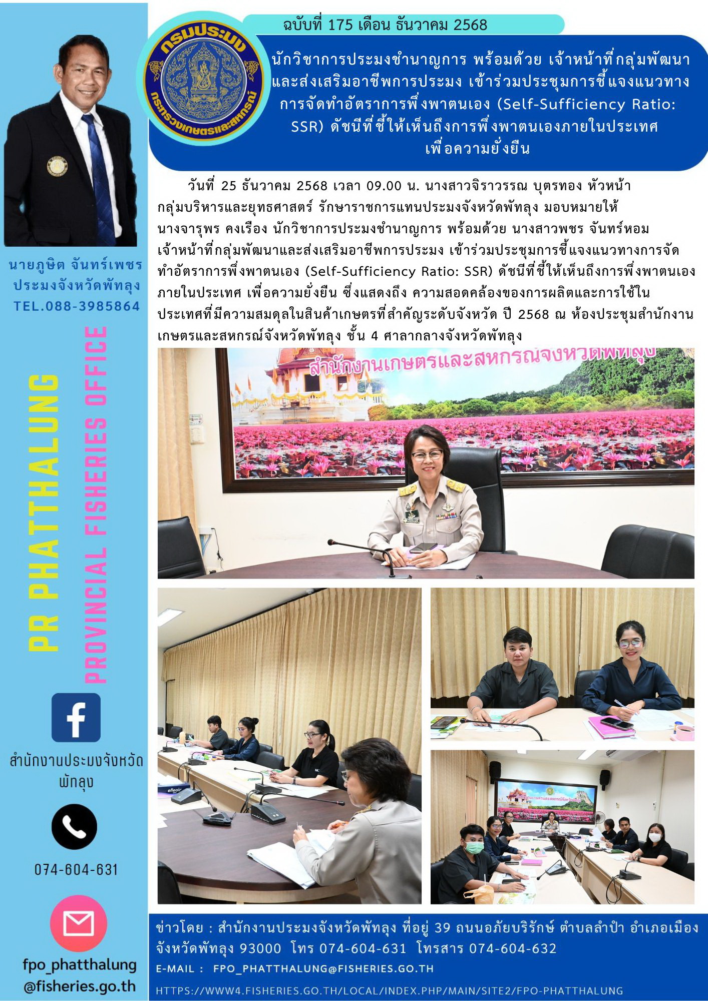 วันที่ 25 ธันวาคม 2568 เวลา 09.00 น. นางสาวจิราวรรณ บุตรทอง หัวหน้ากลุ่มบริหารและยุทธศาสตร์ รักษาราชการแทนประมงจังหวัดพัทลุง มอบหมายให้ นางจารุพร คงเรือง นักวิชาการประมงชำนาญการ พร้อมด้วย นางสาวพชร จันทร์หอม เจ้าหน้าที่กลุ่มพัฒนาและส่งเสริมอาชีพการประมง เข้าร่วมประชุมการชี้แจงแนวทางการจัดทำอัตราการพึ่งพาตนเอง (Self-Sufficiency Ratio: SSR) ดัชนีที่ชี้ให้เห็นถึงการพึ่งพาตนเองภายในประเทศ เพื่อความยั่งยืน ซึ่งแสดงถึง ความสอดคล้องของการผลิตและการใช้ในประเทศที่มีความสมดุลในสินค้าเกษตรที่สำคัญระดับจังหวัด ปี 2568 ณ ห้องประชุมสำนักงานเกษตรและสหกรณ์จังหวัดพัทลุง ชั้น 4 ศาลากลางจังหวัดพัทลุง