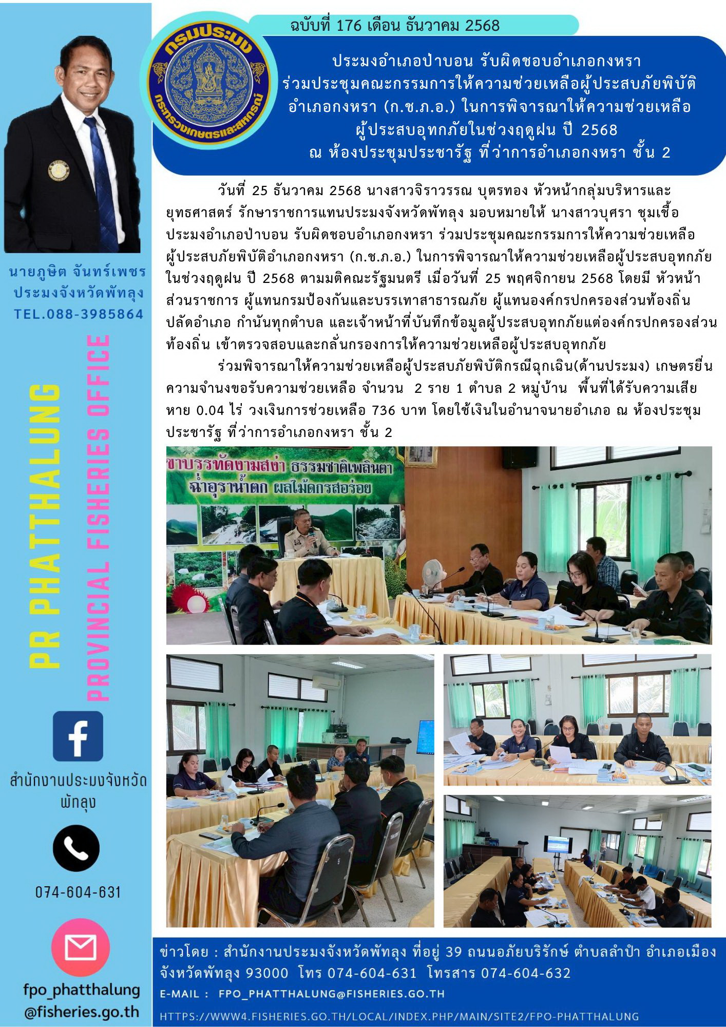วันที่ 25 ธันวาคม 2568 นางสาวจิราวรรณ บุตรทอง หัวหน้ากลุ่มบริหารและยุทธศาสตร์ รักษาราชการแทนประมงจังหวัดพัทลุง มอบหมายให้ นางสาวบุศรา ชุมเชื้อ ประมงอำเภอป่าบอน รับผิดชอบอำเภอกงหรา ร่วมประชุมคณะกรรมการให้ความช่วยเหลือผู้ประสบภัยพิบัติอำเภอกงหรา (ก.ช.ภ.อ.) ในการพิจารณาให้ความช่วยเหลือผู้ประสบอุทกภัยในช่วงฤดูฝน ปี 2568 ตามมติคณะรัฐมนตรี เมื่อวันที่ 25 พฤศจิกายน 2568 โดยมี หัวหน้าส่วนราชการ ผู้แทนกรมป้องกันและบรรเทาสาธารณภัย ผู้แทนองค์กรปกครองส่วนท้องถิ่น ปลัดอำเภอ กำนันทุกตำบล และเจ้าหน้าที่บันทึกข้อมูลผู้ประสบอุทกภัยแต่องค์กรปกครองส่วนท้องถิ่น เข้าตรวจสอบและกลั่นกรองการให้ความช่วยเหลือผู้ประสบอุทกภัย ร่วมพิจารณาให้ความช่วยเหลือผู้ประสบภัยพิบัติกรณีฉุกเฉิน(ด้านประมง) เกษตรยื่นความจำนงขอรับความช่วยเหลือ จำนวน 2 ราย 1 ตำบล 2 หมู่บ้าน พื้นที่ได้รับความเสียหาย 0.04 ไร่ วงเงินการช่วยเหลือ 736 บาท โดยใช้เงินในอำนาจนายอำเภอ ณ ห้องประชุมประชารัฐ ที่ว่าการอำเภอกงหรา ชั้น 2