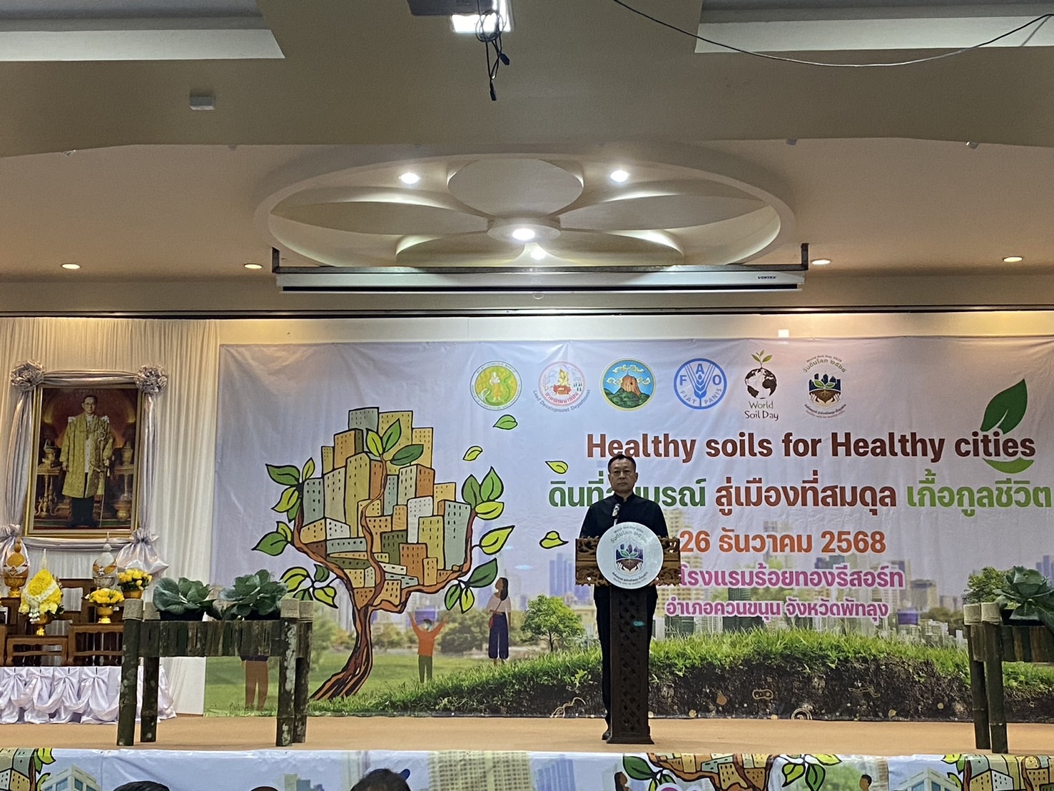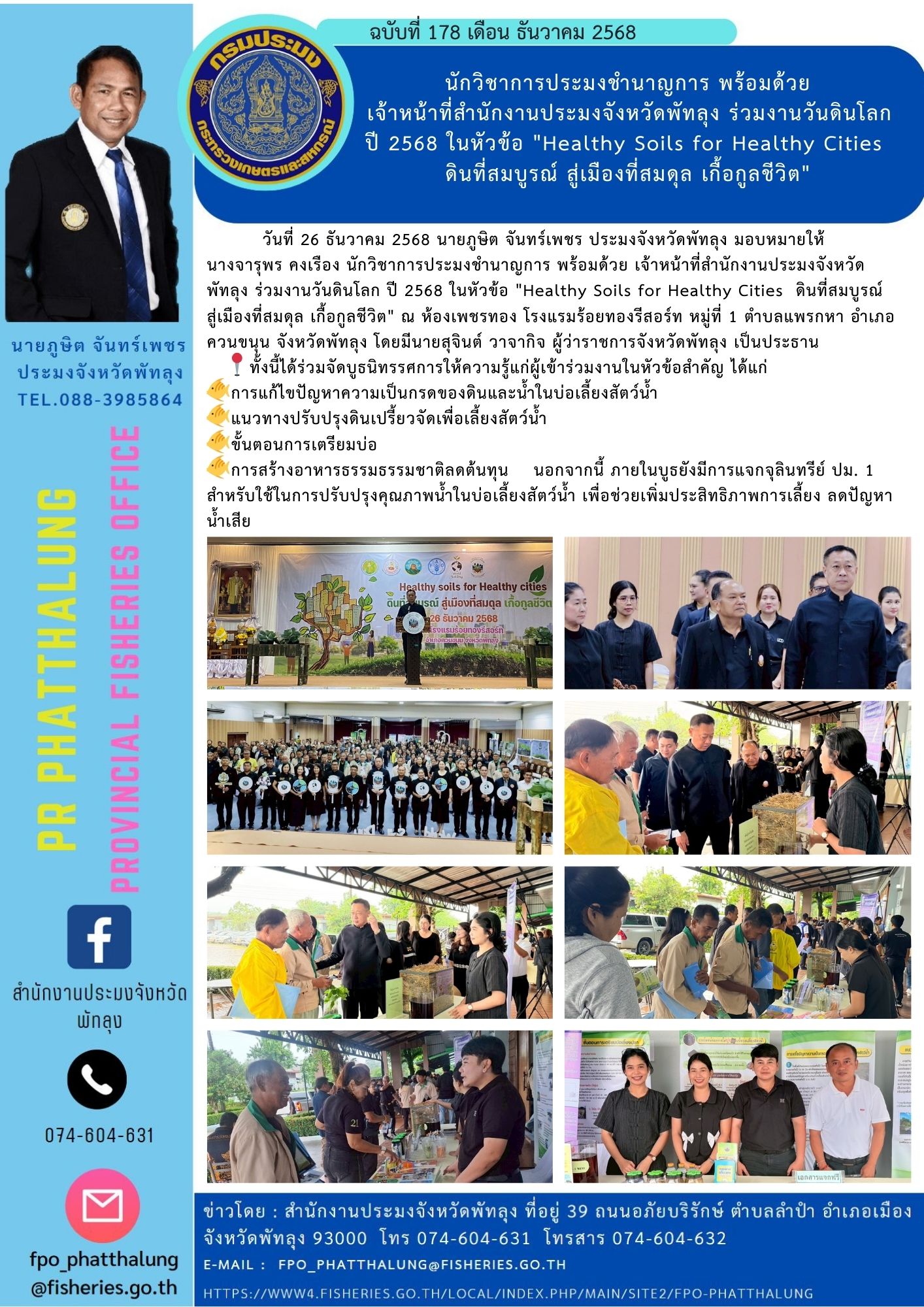 วันที่ 26 ธันวาคม 2568 นายภูษิต จันทร์เพชร ประมงจังหวัดพัทลุง มอบหมายให้ นางจารุพร คงเรือง นักวิชาการประมงชำนาญการ พร้อมด้วย เจ้าหน้าที่สำนักงานประมงจังหวัดพัทลุง ร่วมงานวันดินโลก ปี 2568 ในหัวข้อ "Healthy Soils for Healthy Cities ดินที่สมบูรณ์ สู่เมืองที่สมดุล เกื้อกูลชีวิต" ณ ห้องเพชรทอง โรงแรมร้อยทองรีสอร์ท หมู่ที่ 1 ตำบลแพรกหา อำเภอควนขนุน จังหวัดพัทลุง โดยมีนายสุจินต์ วาจากิจ ผู้ว่าราชการจังหวัดพัทลุง เป็นประธาน