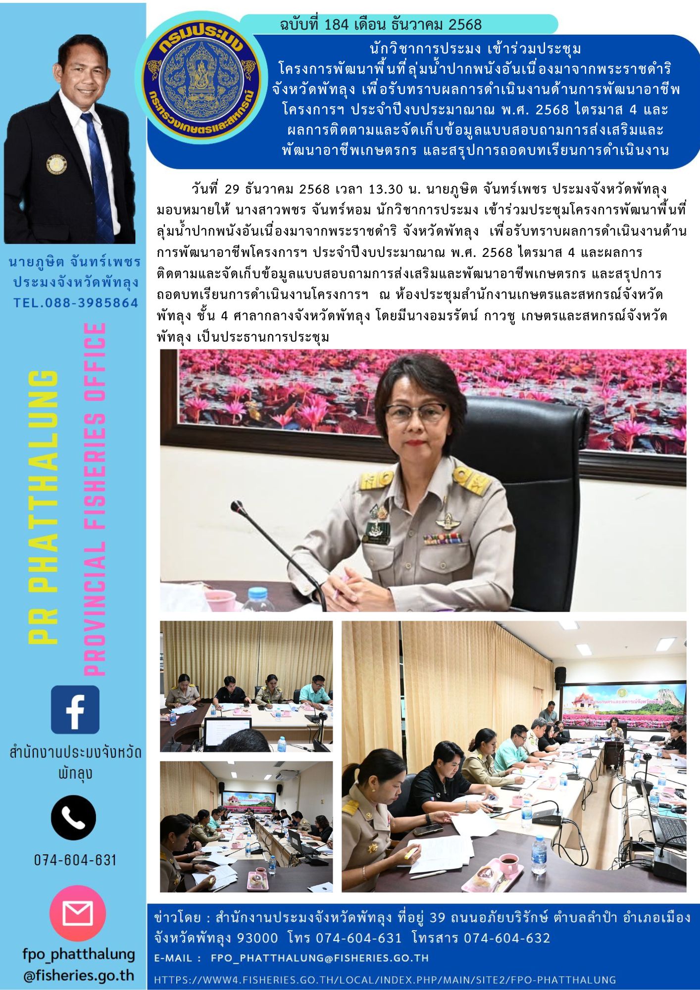 วันที่ 29 ธันวาคม 2568 เวลา 13.30 น. นายภูษิต จันทร์เพชร ประมงจังหวัดพัทลุง มอบหมายให้ นางสาวพชร จันทร์หอม นักวิชาการประมง เข้าร่วมประชุมโครงการพัฒนาพื้นที่ลุ่มน้ำปากพนังอันเนื่องมาจากพระราชดำริ จังหวัดพัทลุง เพื่อรับทราบผลการดำเนินงานด้านการพัฒนาอาชีพโครงการฯ ประจำปีงบประมาณาณ พ.ศ. 2568 ไตรมาส 4 และผลการติดตามและจัดเก็บข้อมูลแบบสอบถามการส่งเสริมและพัฒนาอาชีพเกษตรกร และสรุปการถอดบทเรียนการดำเนินงานโครงการฯ ณ ห้องประชุมสำนักงานเกษตรและสหกรณ์จังหวัดพัทลุง ชั้น 4 ศาลากลางจังหวัดพัทลุง โดยมีนางอมรรัตน์ กาวชู เกษตรและสหกรณ์จังหวัดพัทลุง เป็นประธานการประชุม