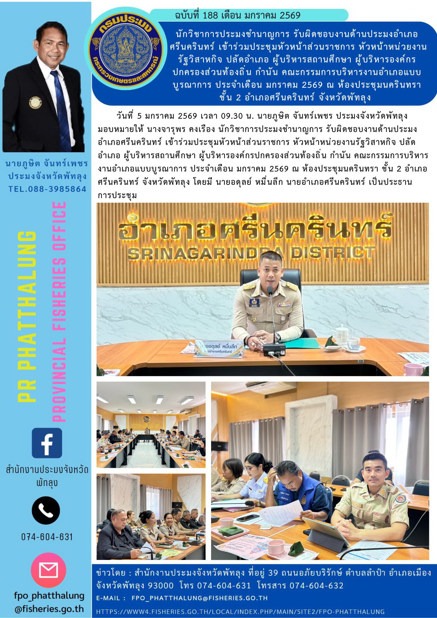 วันที่ 5 มกราคม 2569 เวลา 09.30 น. นายภูษิต จันทร์เพชร ประมงจังหวัดพัทลุง มอบหมายให้ นางจารุพร คงเรือง นักวิชาการประมงชำนาญการ รับผิดชอบงานด้านประมงอำเภอศรีนครินทร์ เข้าร่วมประชุมหัวหน้าส่วนราชการ หัวหน้าหน่วยงานรัฐวิสาหกิจ ปลัดอำเภอ ผู้บริหารสถานศึกษา ผู้บริหารองค์กรปกครองส่วนท้องถิ่น กำนัน คณะกรรมการบริหารงานอำเภอแบบบูรณาการ ประจำเดือน มกราคม 2569 ณ ห้องประชุมนครินทรา ชั้น 2 อำเภอศรีนครินทร์ จังหวัดพัทลุง โดยมี นายอดุลย์ หมื่นลึก นายอำเภอศรีนครินทร์ เป็นประธานการประชุม