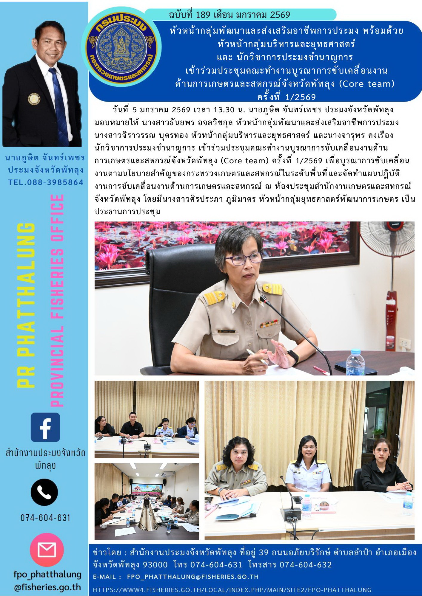 หัวหน้ากลุ่มพัฒนาและส่งเสริมอาชีพการประมง พร้อมด้วย หัวหน้ากลุ่มบริหารและยุทธศาสตร์ และ นักวิชาการประมงชำนาญการ เข้าร่วมประชุมคณะทำงานบูรณาการขับเคลื่อนงาน ด้านการเกษตรและสหกรณ์จังหวัดพัทลุง (Core team) ครั้งที่ 1/2569