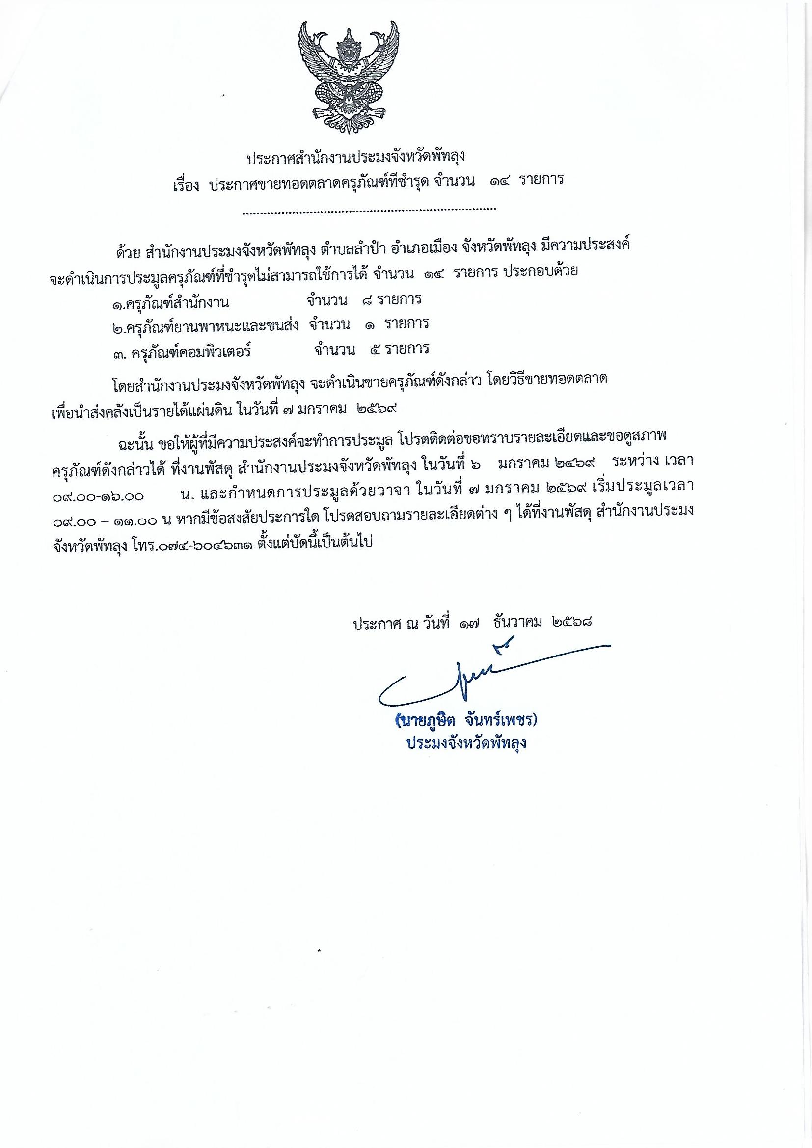 สำนักงานประมงจังหวัดพัทลุง ประกาศขายทอดตลาดครุภัณฑ์ที่ชำรุด จำนวน 14 รายการ