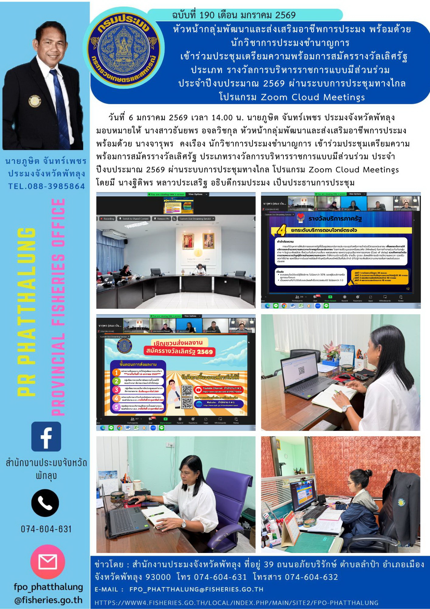 วันที่ 6 มกราคม 2569 เวลา 14.00 น. นายภูษิต จันทร์เพชร ประมงจังหวัดพัทลุง มอบหมายให้ นางสาวธันยพร อจลวิชกุล หัวหน้ากลุ่มพัฒนาและส่งเสริมอาชีพการประมง พร้อมด้วย นางจารุพร คงเรือง นักวิชาการประมงชำนาญการ เข้าร่วมประชุมเตรียมความพร้อมการสมัครรางวัลเลิศรัฐ ประเภทรางวัลการบริหารราชการแบบมีส่วนร่วม ประจำปีงบประมาณ 2569 ผ่านระบบการประชุมทางไกล โปรแกรม Zoom Cloud Meetings โดยมี นางฐิติพร หลาวประเสริฐ อธิบดีกรมประมง เป็นประธานการประชุม