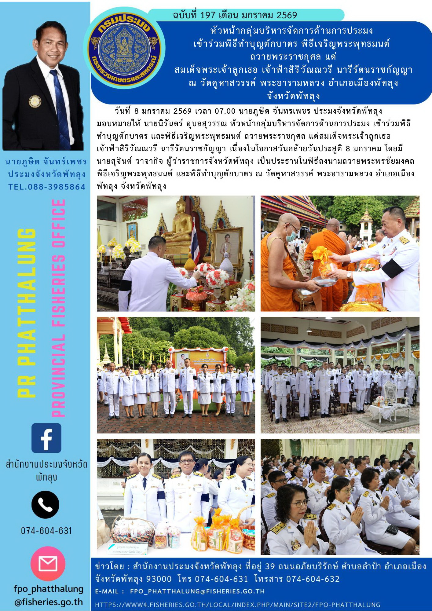 วันที่ 8 มกราคม 2569 เวลา 07.00 นายภูษิต จันทรเพชร ประมงจังหวัดพัทลุง มอบหมายให้ นายนิรันดร์ อุบลสุวรรณ หัวหน้ากลุ่มบริหารจัดการด้านการประมง เข้าร่วมพิธีทำบุญตักบาตร และพิธีเจริญพระพุทธมนต์ ถวายพระราชกุศล แด่สมเด็จพระเจ้าลูกเธอเจ้าฟ้าสิริวัณณวรี นารีรัตนราชกัญญา เนื่องในโอกาสวันคล้ายวันประสูติ 8 มกราคม โดยมี นายสุจินต์ วาจากิจ ผู้ว่าราชการจังหวัดพัทลุง เป็นประธานในพิธีลงนามถวายพระพรชัยมงคล พิธีเจริญพระพุทธมนต์ และพิธีทำบุญตักบาตร ณ วัดคูหาสวรรค์ พระอารามหลวง อำเภอเมืองพัทลุง จังหวัดพัทลุง