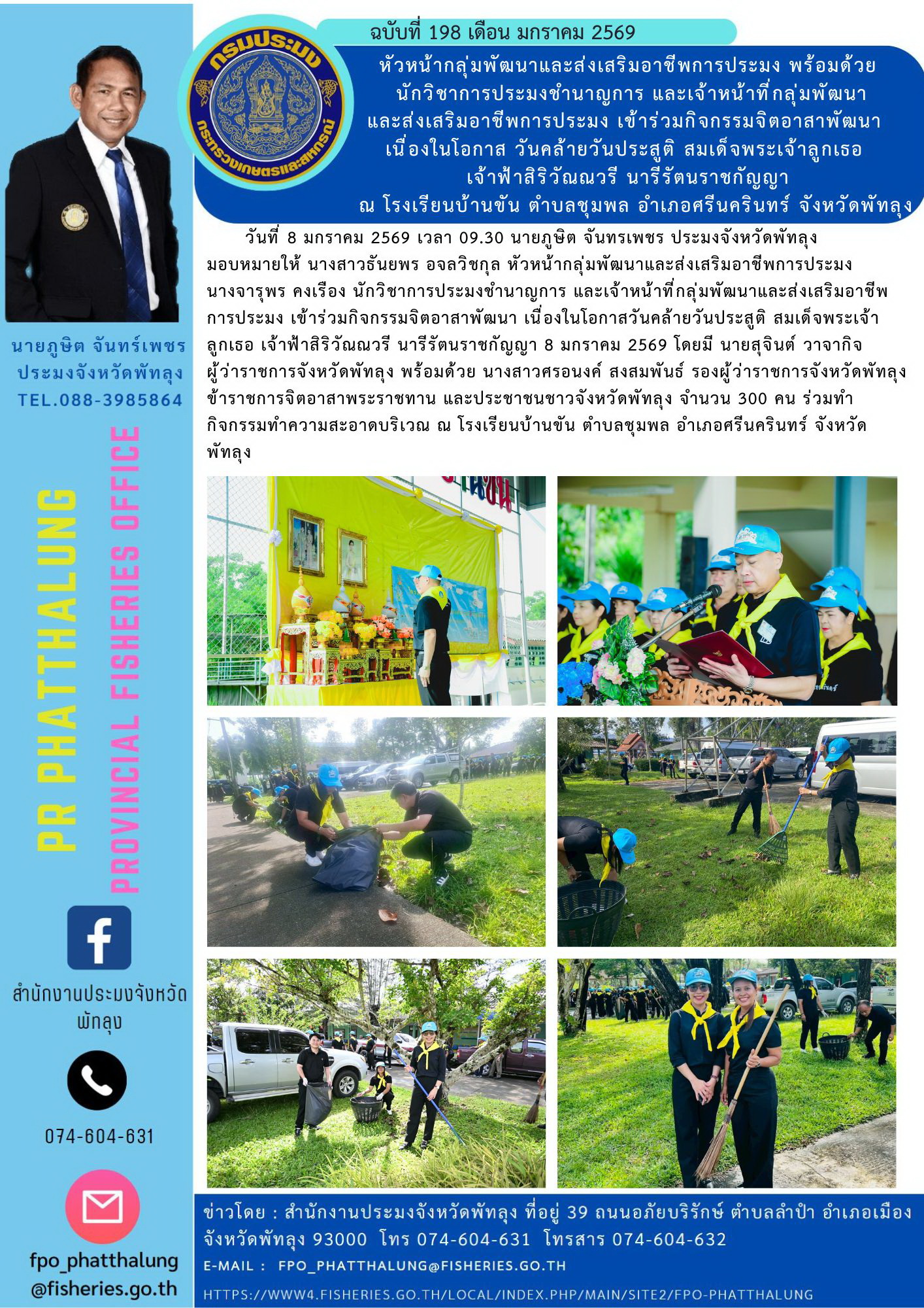 นักวิชาการประมงชำนาญการ และเจ้าหน้าที่กลุ่มพัฒนาและส่งเสริมอาชีพการประมง เข้าร่วมกิจกรรมจิตอาสาพัฒนา เนื่องในโอกาสวันคล้ายวันประสูติ สมเด็จพระเจ้าลูกเธอ เจ้าฟ้าสิริวัณณวรี นารีรัตนราชกัญญา 8 มกราคม 2569 โดยมี นายสุจินต์ วาจากิจ ผู้ว่าราชการจังหวัดพัทลุง พร้อมด้วย นางสาวศรอนงค์ สงสมพันธ์ รองผู้ว่าราชการจังหวัดพัทลุง ข้าราชการจิตอาสาพระราชทาน และประชาชนชาวจังหวัดพัทลุง จำนวน 300 คน ร่วมทำกิจกรรมทำความสะอาดบริเวณ ณ โรงเรียนบ้านขัน ตำบลชุมพล อำเภอศรีนครินทร์ จังหวัดพัทลุง