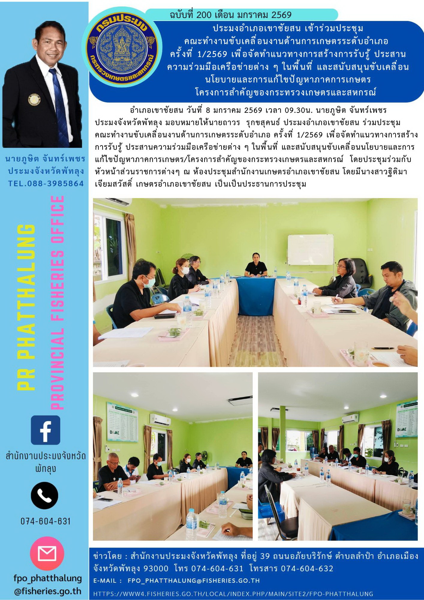 อำเภอเขาชัยสน วันที่ 8 มกราคม 2569 เวลา 09.30น. นายภูษิต จันทร์เพชร ประมงจังหวัดพัทลุง มอบหมายให้นายถาวร รุกขสุคนธ์ ประมงอำเภอเขาชัยสน ร่วมประชุมคณะทำงานขับเคลื่อนงานด้านการเกษตรระดับอำเภอ ครั้งที่ 1/2569? เพื่อจัดทำแนวทางการสร้างการรับรู้ ประสานความร่วมมือเครือข่ายต่าง ๆ ในพื้นที่ และสนับสนุนขับเคลื่อนนโยบายและการแก้ไขปัญหาภาคการเกษตร/โครงการสำคัญของกระทรวงเกษตรและสหกรณ์? โดยประชุมร่วมกับหัวหน้าส่วนราชการต่างๆ? ณ ห้องประชุมสำนักงานเกษตรอำเภอเขาชัยสน โดยมีนางสาวฐิติมา เจียมสวัสดิ์ เกษตรอำเภอเขาชัยสน? เป็นเป็นประธานการประชุม