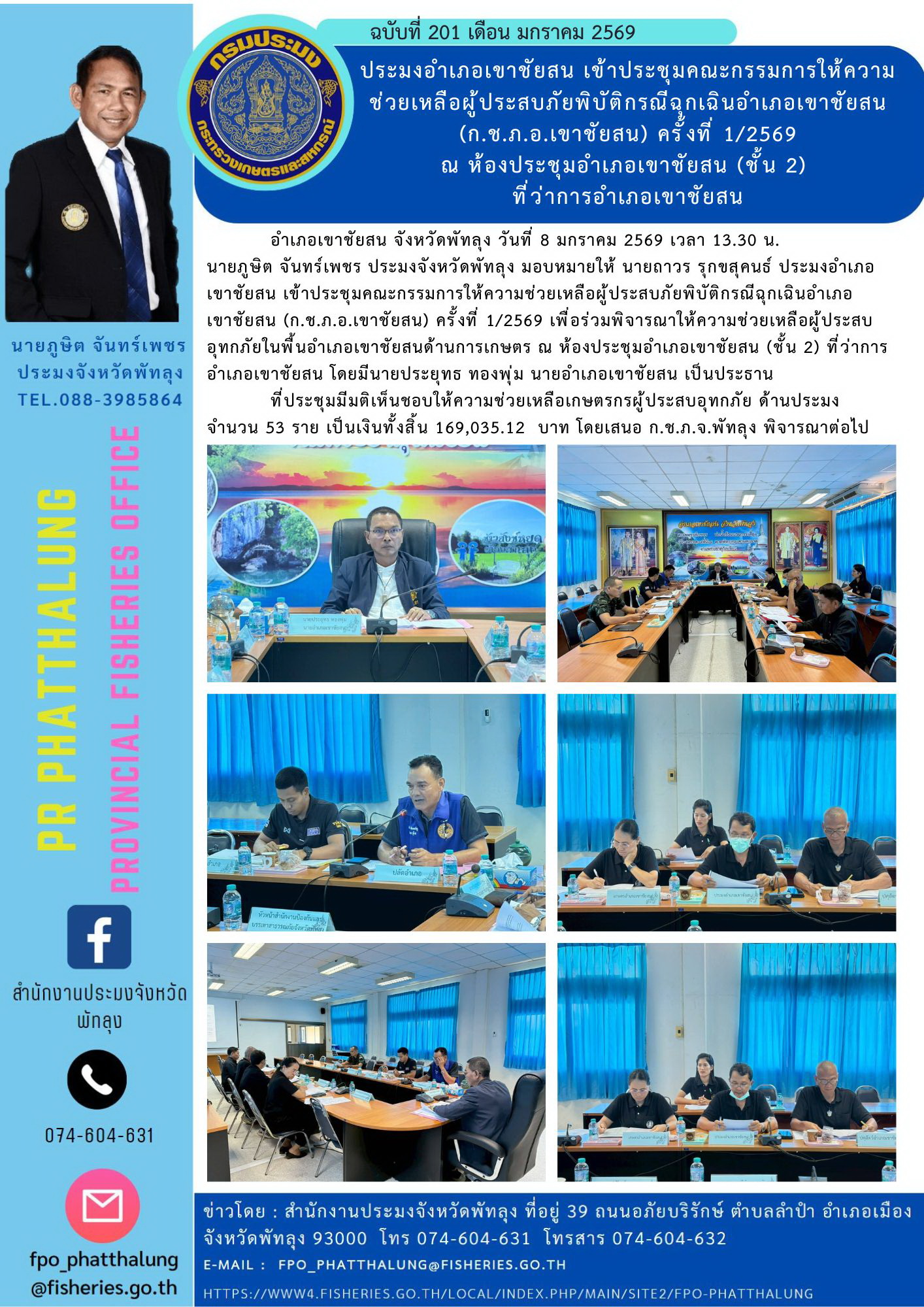 อำเภอเขาชัยสน จังหวัดพัทลุง วันที่ 8 มกราคม 2569 เวลา 13.30 น. นายภูษิต จันทร์เพชร ประมงจังหวัดพัทลุง มอบหมายให้ นายถาวร รุกขสุคนธ์ ประมงอำเภอเขาชัยสน เข้าประชุมคณะกรรมการให้ความช่วยเหลือผู้ประสบภัยพิบัติกรณีฉุกเฉินอำเภอเขาชัยสน (ก.ช.ภ.อ.เขาชัยสน) ครั้งที่ 1/2569 เพื่อร่วมพิจารณาให้ความช่วยเหลือผู้ประสบอุทกภัยในพื้นอำเภอเขาชัยสนด้านการเกษตร ณ ห้องประชุมอำเภอเขาชัยสน (ชั้น 2) ที่ว่าการอำเภอเขาชัยสน โดยมีนายประยุทธ ทองพุ่ม นายอำเภอเขาชัยสน เป็นประธานที่ประชุมมีมติเห็นชอบให้ความช่วยเหลือเกษตรกรผู้ประสบอุทกภัย ด้านประมง จำนวน 53 ราย เป็นเงินทั้งสิ้น 169,035.12 บาท โดยเสนอ ก.ช.ภ.จ.พัทลุง พิจารณาต่อไป