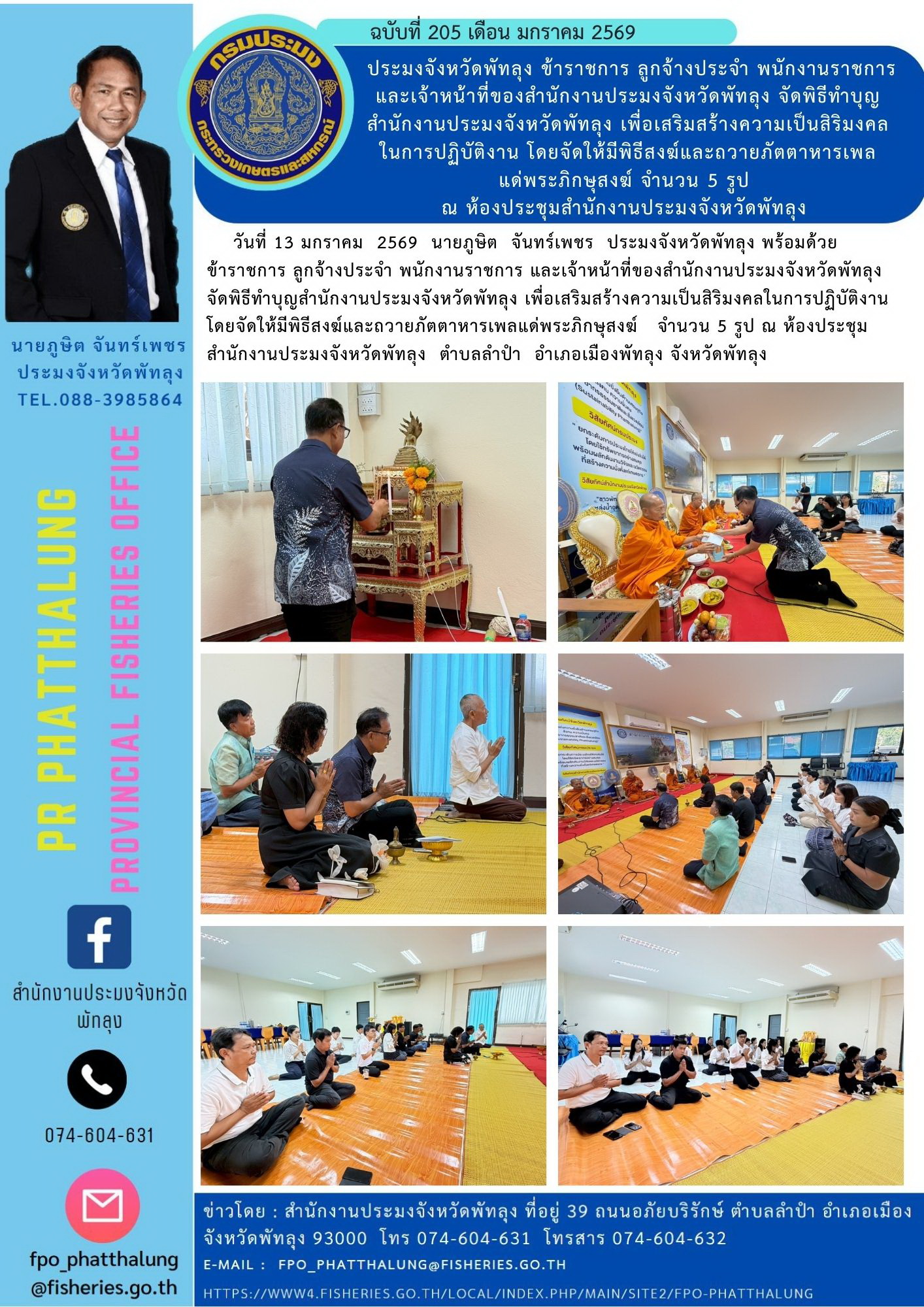 วันที่ 13 มกราคม 2569 นายภูษิต จันทร์เพชร ประมงจังหวัดพัทลุง พร้อมด้วยข้าราชการ ลูกจ้างประจำ พนักงานราชการ และเจ้าหน้าที่ของสำนักงานประมงจังหวัดพัทลุง จัดพิธีทำบุญสำนักงานประมงจังหวัดพัทลุง เพื่อเสริมสร้างความเป็นสิริมงคลในการปฏิบัติงาน โดยจัดให้มีพิธีสงฆ์และถวายภัตตาหารเพลแด่พระภิกษุสงฆ์ จำนวน 5 รูป ณ ห้องประชุมสำนักงานประมงจังหวัดพัทลุง ตำบลลำปำ อำเภอเมืองพัทลุง จังหวัดพัทลุง