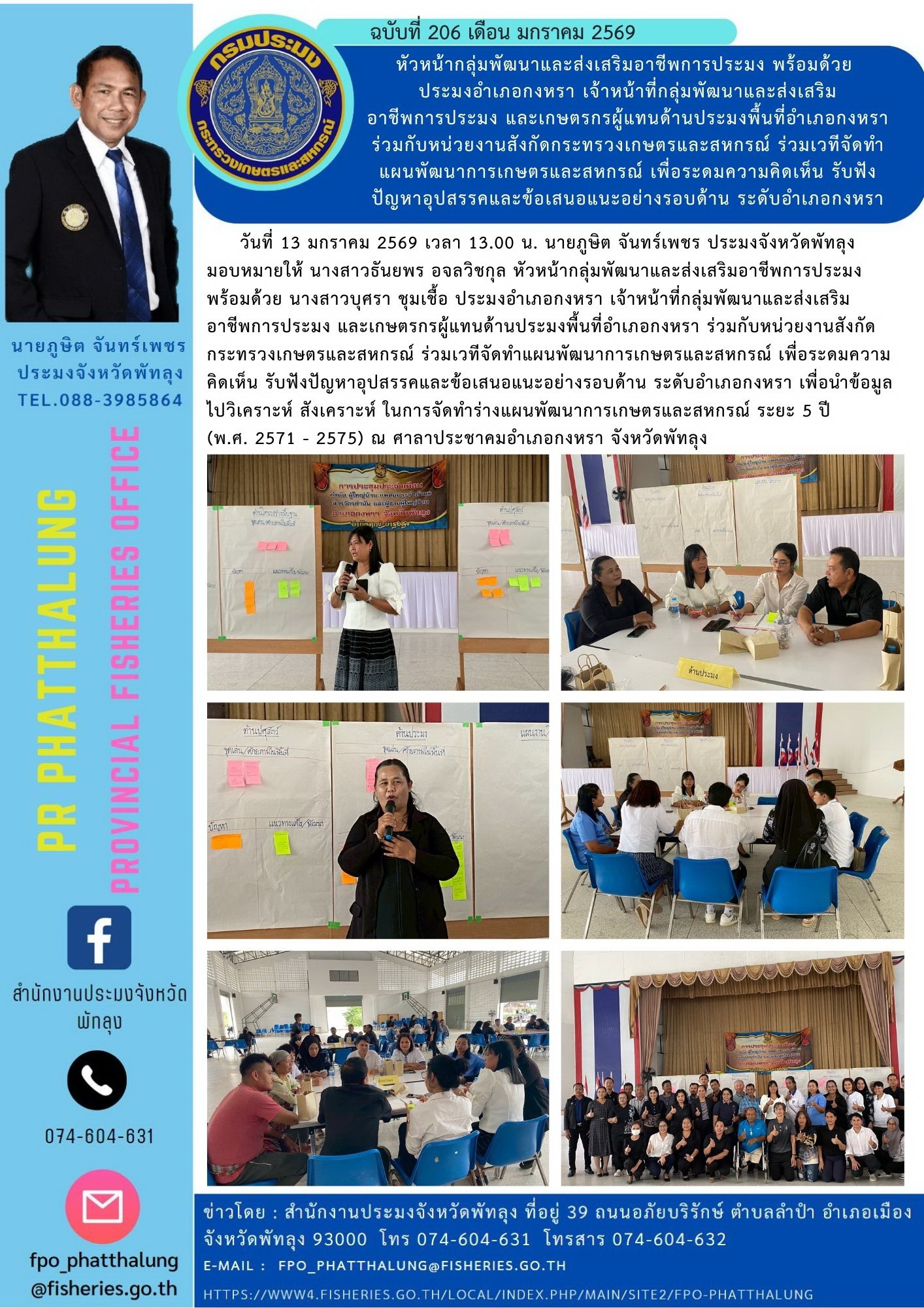 วันที่ 13 มกราคม 2569 เวลา 13.00 น. นายภูษิต จันทร์เพชร ประมงจังหวัดพัทลุง มอบหมายให้ นางสาวธันยพร อจลวิชกุล หัวหน้ากลุ่มพัฒนาและส่งเสริมอาชีพการประมง พร้อมด้วย นางสาวบุศรา ชุมเชื้อ ประมงอำเภอกงหรา เจ้าหน้าที่กลุ่มพัฒนาและส่งเสริมอาชีพการประมง และเกษตรกรผู้แทนด้านประมงพื้นที่อำเภอกงหรา ร่วมกับหน่วยงานสังกัดกระทรวงเกษตรและสหกรณ์ ร่วมเวทีจัดทำแผนพัฒนาการเกษตรและสหกรณ์ เพื่อระดมความคิดเห็น รับฟังปัญหาอุปสรรคและข้อเสนอแนะอย่างรอบด้าน ระดับอำเภอกงหรา เพื่อนำข้อมูลไปวิเคราะห์ สังเคราะห์ ในการจัดทำร่างแผนพัฒนาการเกษตรและสหกรณ์ ระยะ 5 ปี (พ.ศ. 2571 - 2575) ณ ศาลาประชาคมอำเภอกงหรา จังหวัดพัทลุง