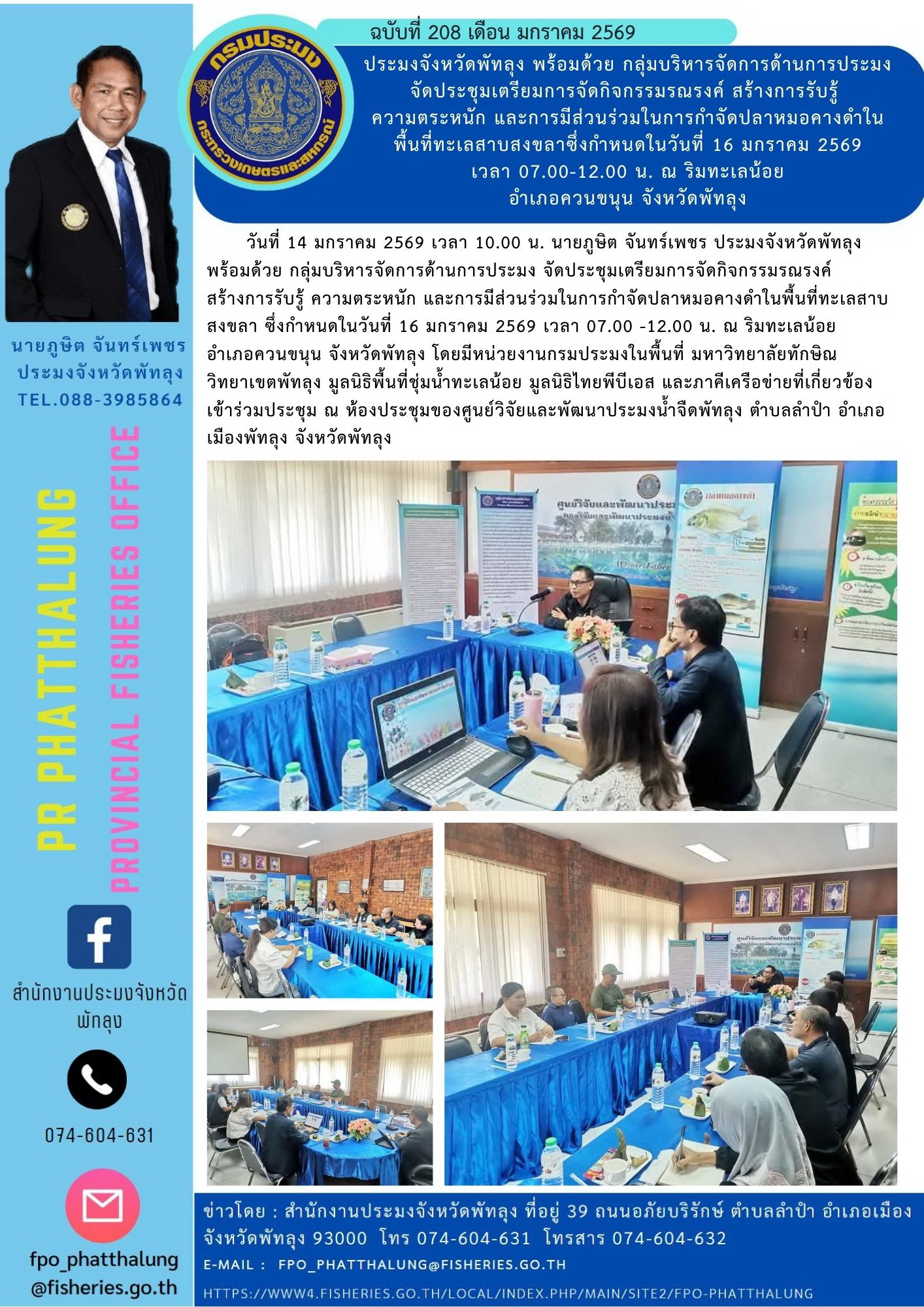 ประมงจังหวัดพัทลุง พร้อมด้วย กลุ่มบริหารจัดการด้านการประมง จัดประชุมเตรียมการจัดกิจกรรมรณรงค์ สร้างการรับรู้ ความตระหนัก และการมีส่วนร่วมในการกำจัดปลาหมอคางดำในพื้นที่ทะเลสาบสงขลาซึ่งกำหนดในวันที่ 16 มกราคม 2569 เวลา 07.00-12.00 น. ณ ริมทะเลน้อย อำเภอควนขนุน จังหวัดพัทลุง