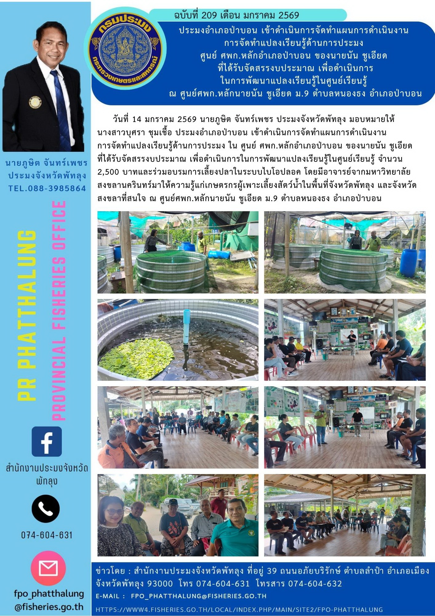วันที่ 14 มกราคม 2569 นายภูษิต จันทร์เพชร ประมงจังหวัดพัทลุง มอบหมายให้นางสาวบุศรา ชุมเชื้อ ประมงอำเภอป่าบอน เข้าดำเนินการจัดทำแผนการดำเนินงานการจัดทำแปลงเรียนรู้ด้านการประมง ใน ศูนย์ ศพก.หลักอำเภอป่าบอน ของนายนัน ชูเอียดที่ได้รับจัดสรรงบประมาณ เพื่อดำเนินการในการพัฒนาแปลงเรียนรู้ในศูนย์เรียนรู้ จำนวน 2,500 บาทและร่วมอบรมการเลี้ยงปลาในระบบไบโอปลอค โดยมีอาจารย์จากมหาวิทยาลัยสงขลานครินทร์มาให้ความรู้แก่เกษตรกรผู้เพาะเลี้ยงสัตว์น้ำในพื้นที่จังหวัดพัทลุง และจังหวัดสงขลาที่สนใจ ณ ศูนย์ศพก.หลักนายนัน ชูเอียด ม.9 ตำบลหนองธง อำเภอป่าบอน