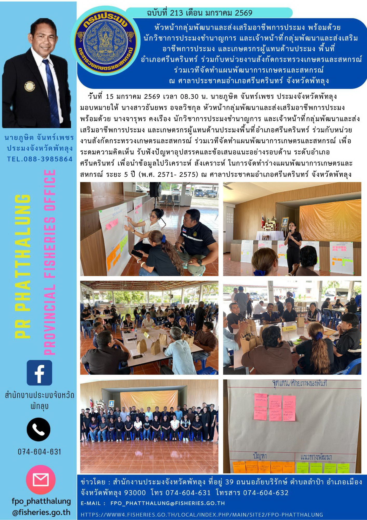 วัันที่ 15 มกราคม 2569 เวลา 08.30 น. นายภูษิต จันทร์เพชร ประมงจังหวัดพัทลุง มอบหมายให้ นางสาวธันยพร อจลวิชกุล หัวหน้ากลุ่มพัฒนาและส่งเสริมอาชีพการประมง พร้อมด้วย นางจารุพร คงเรือง นักวิชาการประมงชำนาญการ และเจ้าหน้าที่กลุ่มพัฒนาและส่งเสริมอาชีพการประมง และเกษตรกรผู้แทนด้านประมงพื้นที่อำเภอศรีนครินทร์ ร่วมกับหน่วยงานสังกัดกระทรวงเกษตรและสหกรณ์ ร่วมเวทีจัดทำแผนพัฒนาการเกษตรและสหกรณ์ เพื่อระดมความคิดเห็น รับฟังปัญหาอุปสรรคและข้อเสนอแนะอย่างรอบด้าน ระดับอำเภอศรีนครินทร์ เพื่อนำข้อมูลไปวิเคราะห์ สังเคราะห์ ในการจัดทำร่างแผนพัฒนาการเกษตรและสหกรณ์ ระยะ 5 ปี (พ.ศ. 2571- 2575) ณ ศาลาประชาคมอำเภอศรีนครินทร์ จังหวัดพัทลุง