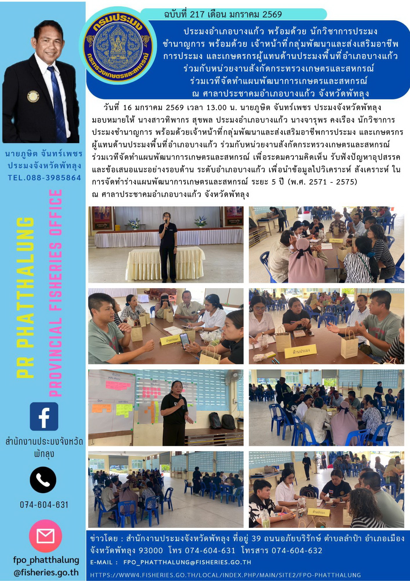 วันที่ 16 มกราคม 2569 เวลา 13.00 น. นายภูษิต จันทร์เพชร ประมงจังหวัดพัทลุง มอบหมายให้ นางสาวทิพากร สุขพล ประมงอำเภอบางแก้ว นางจารุพร คงเรือง นักวิชาการประมงชำนาญการ พร้อมด้วยเจ้าหน้าที่กลุ่มพัฒนาและส่งเสริมอาชีพการประมง และเกษตรกรผู้แทนด้านประมงพื้นที่อำเภอบางแก้ว ร่วมกับหน่วยงานสังกัดกระทรวงเกษตรและสหกรณ์ ร่วมเวทีจัดทำแผนพัฒนาการเกษตรและสหกรณ์ เพื่อระดมความคิดเห็น รับฟังปัญหาอุปสรรคและข้อเสนอแนะอย่างรอบด้าน ระดับอำเภอบางแก้ว เพื่อนำข้อมูลไปวิเคราะห์ สังเคราะห์ ในการจัดทำร่างแผนพัฒนาการเกษตรและสหกรณ์ ระยะ 5 ปี (พ.ศ. 2571 - 2575) ณ ศาลาประชาคมอำเภอบางแก้ว จังหวัดพัทลุง