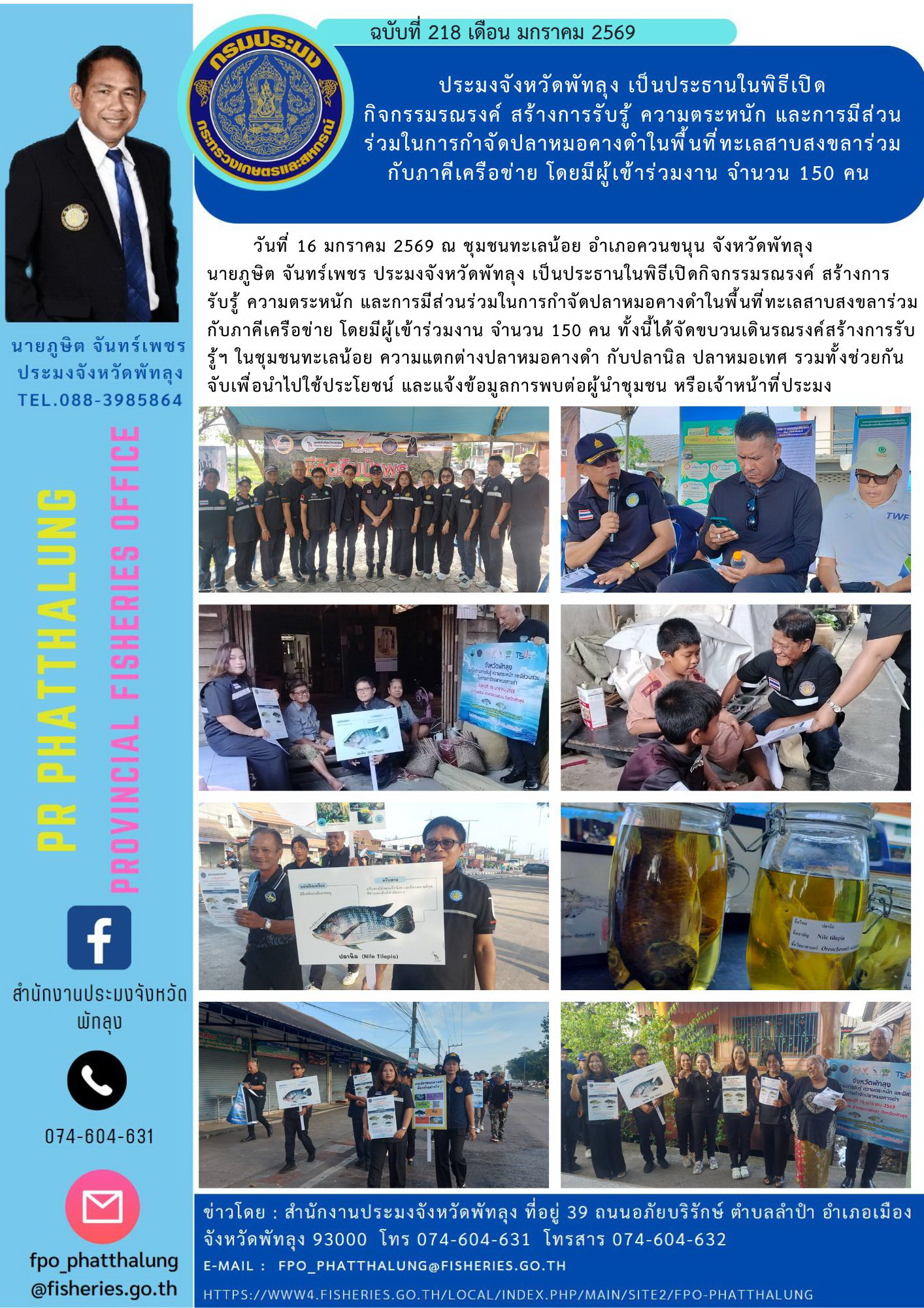 วันที่ 16 มกราคม 2569 ณ ชุมชนทะเลน้อย อำเภอควนขนุน จังหวัดพัทลุง นายภูษิต จันทร์เพชร ประมงจังหวัดพัทลุง เป็นประธานในพิธีเปิดกิจกรรมรณรงค์ สร้างการรับรู้ ความตระหนัก และการมีส่วนร่วมในการกำจัดปลาหมอคางดำในพื้นที่ทะเลสาบสงขลาร่วมกับภาคีเครือข่าย โดยมีผู้เข้าร่วมงาน จำนวน 150 คน ทั้งนี้ได้จัดขบวนเดินรณรงค์สร้างการรับรู้ฯ ในชุมชนทะเลน้อย ความแตกต่างปลาหมอคางดำ กับปลานิล ปลาหมอเทศ รวมทั้งช่วยกันจับเพื่อนำไปใช้ประโยชน์ และแจ้งข้อมูลการพบต่อผู้นำชุมชน หรือเจ้าหน้าที่ประมง