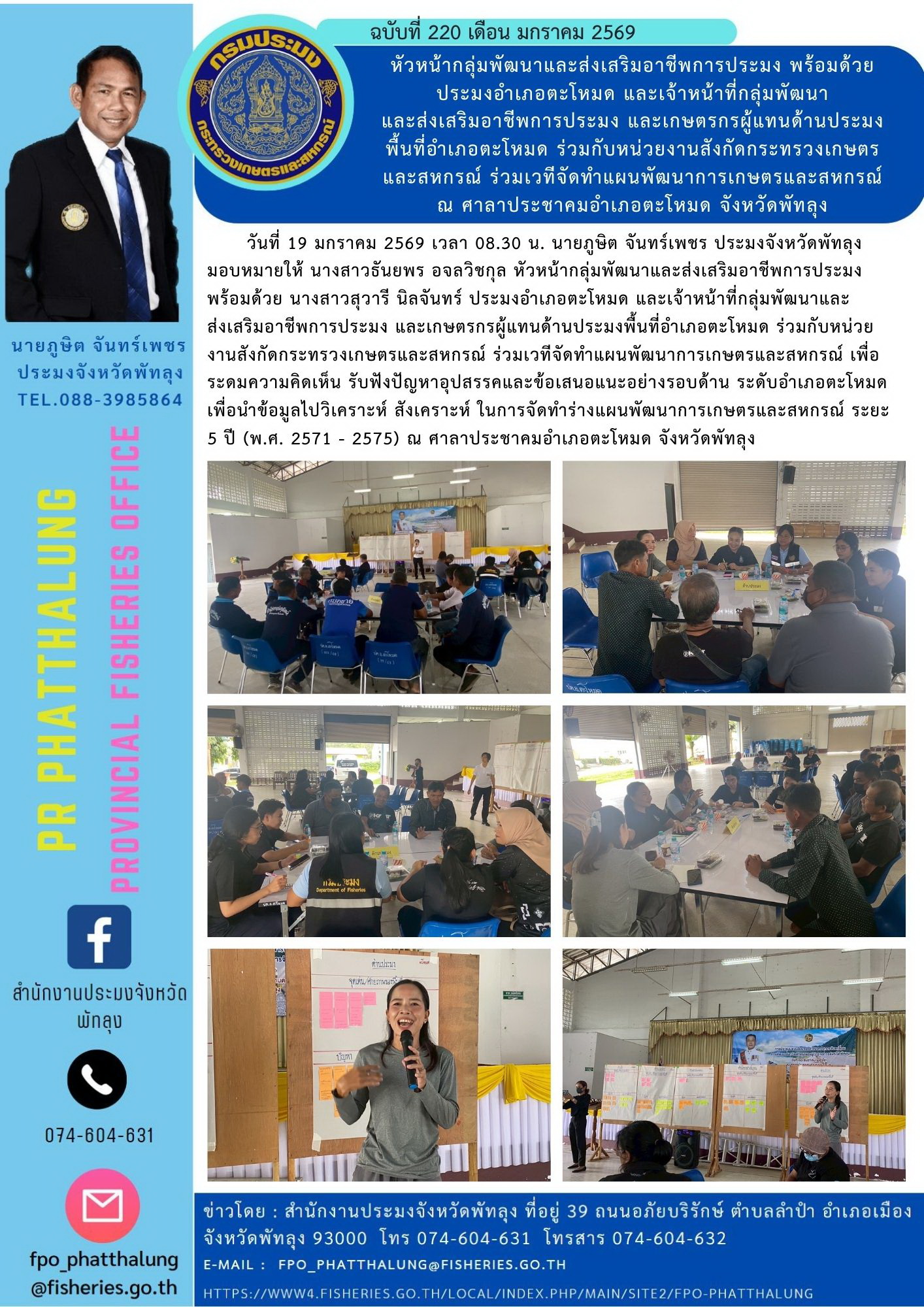 วันที่ 19 มกราคม 2569 เวลา 08.30 น. นายภูษิต จันทร์เพชร ประมงจังหวัดพัทลุง มอบหมายให้ นางสาวธันยพร อจลวิชกุล หัวหน้ากลุ่มพัฒนาและส่งเสริมอาชีพการประมง พร้อมด้วย นางสาวสุวารี นิลจันทร์ ประมงอำเภอตะโหมด และเจ้าหน้าที่กลุ่มพัฒนาและส่งเสริมอาชีพการประมง และเกษตรกรผู้แทนด้านประมงพื้นที่อำเภอตะโหมด ร่วมกับหน่วยงานสังกัดกระทรวงเกษตรและสหกรณ์ ร่วมเวทีจัดทำแผนพัฒนาการเกษตรและสหกรณ์ เพื่อระดมความคิดเห็น รับฟังปัญหาอุปสรรคและข้อเสนอแนะอย่างรอบด้าน ระดับอำเภอตะโหมด เพื่อนำข้อมูลไปวิเคราะห์ สังเคราะห์ ในการจัดทำร่างแผนพัฒนาการเกษตรและสหกรณ์ ระยะ 5 ปี (พ.ศ. 2571 - 2575) ณ ศาลาประชาคมอำเภอตะโหมด จังหวัดพัทลุง