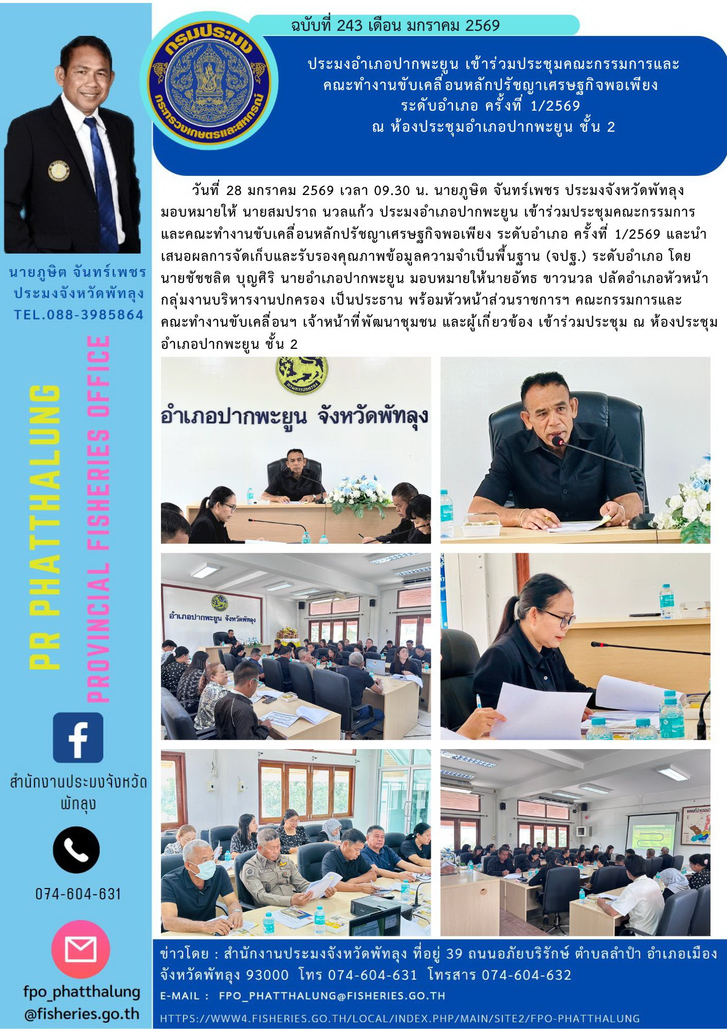 วันที่ 28 มกราคม 2569 เวลา 09.30 น. นายภูษิต จันทร์เพชร ประมงจังหวัดพัทลุง มอบหมายให้ นายสมปราถ นวลแก้ว ประมงอำเภอปากพะยูน เข้าร่วมประชุมคณะกรรมการและคณะทำงานขับเคลื่อนหลักปรัชญาเศรษฐกิจพอเพียง ระดับอำเภอ ครั้งที่ 1/2569 และนำเสนอผลการจัดเก็บและรับรองคุณภาพข้อมูลความจำเป็นพื้นฐาน (จปฐ.) ระดับอำเภอ โดยนายชัชชลิต บุญศิริ นายอำเภอปากพะยูน มอบหมายให้นายอัทธ ขาวนวล ปลัดอำเภอหัวหน้ากลุ่มงานบริหารงานปกครอง เป็นประธาน พร้อมหัวหน้าส่วนราชการฯ คณะกรรมการและคณะทำงานขับเคลื่อนฯ