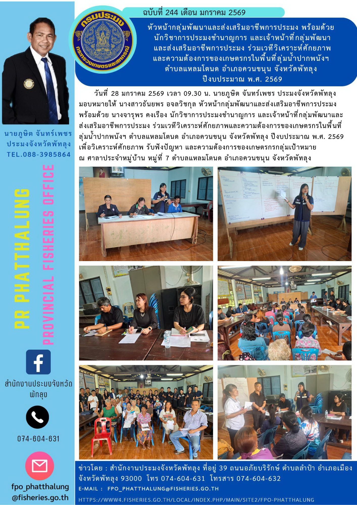วันที่ 28 มกราคม 2569 เวลา 09.30 น. นายภูษิต จันทร์เพชร ประมงจังหวัดพัทลุง มอบหมายให้ นางสาวธันยพร อจลวิชกุล หัวหน้ากลุ่มพัฒนาและส่งเสริมอาชีพการประมง พร้อมด้วย นางจารุพร คงเรือง นักวิชาการประมงชำนาญการ และเจ้าหน้าที่กลุ่มพัฒนาและส่งเสริมอาชีพการประมง ร่วมเวทีวิเคราะห์ศักยภาพและความต้องการของเกษตรกรในพื้นที่ลุ่มน้ำปากพนังฯ ตำบลแหลมโตนด อำเภอควนขนุน จังหวัดพัทลุง ปีงบประมาณ พ.ศ. 2569 เพื่อวิเคราะห์ศักยภาพ รับฟังปัญหา และความต้องการของเกษตรกรกลุ่มเป้าหมาย ณ ศาลาประจำหมู่บ้าน หมู่ที่ 7 ตำบลแหลมโตนด อำเภอควนขนุน จังหวัดพัทลุง