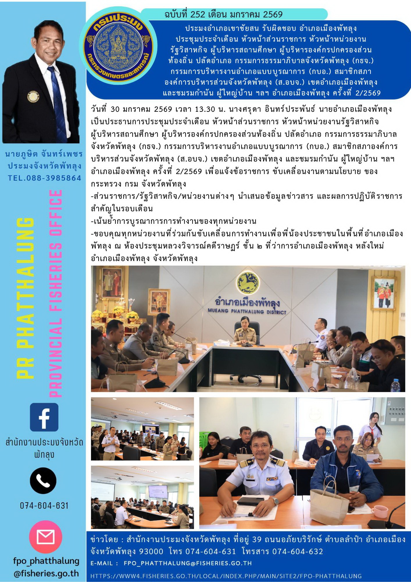 ประมงอำเภอเขาชัยสน รับผิดชอบ อำเภอเมืองพัทลุง ประชุมประจำเดือน หัวหน้าส่วนราชการ หัวหน้าหน่วยงานรัฐวิสาหกิจ ผู้บริหารสถานศึกษา ผู้บริหารองค์กรปกครองส่วน ท้องถิ่น ปลัดอำเภอ กรรมการธรรมาภิบาลจังหวัดพัทลุง (กธจ.) กรรมการบริหารงานอำเภอแบบ?บูรณาการ? (กบอ.) สมาชิกสภาองค์การบริหารส่วนจังหวัดพัทลุง (ส.อบจ.) เขตอำเภอเมืองพัทลุง และชมรมกำนัน ผู้ใหญ่บ้าน ฯลฯ อำเภอเมืองพัทลุง ครั้งที่ 2/2569