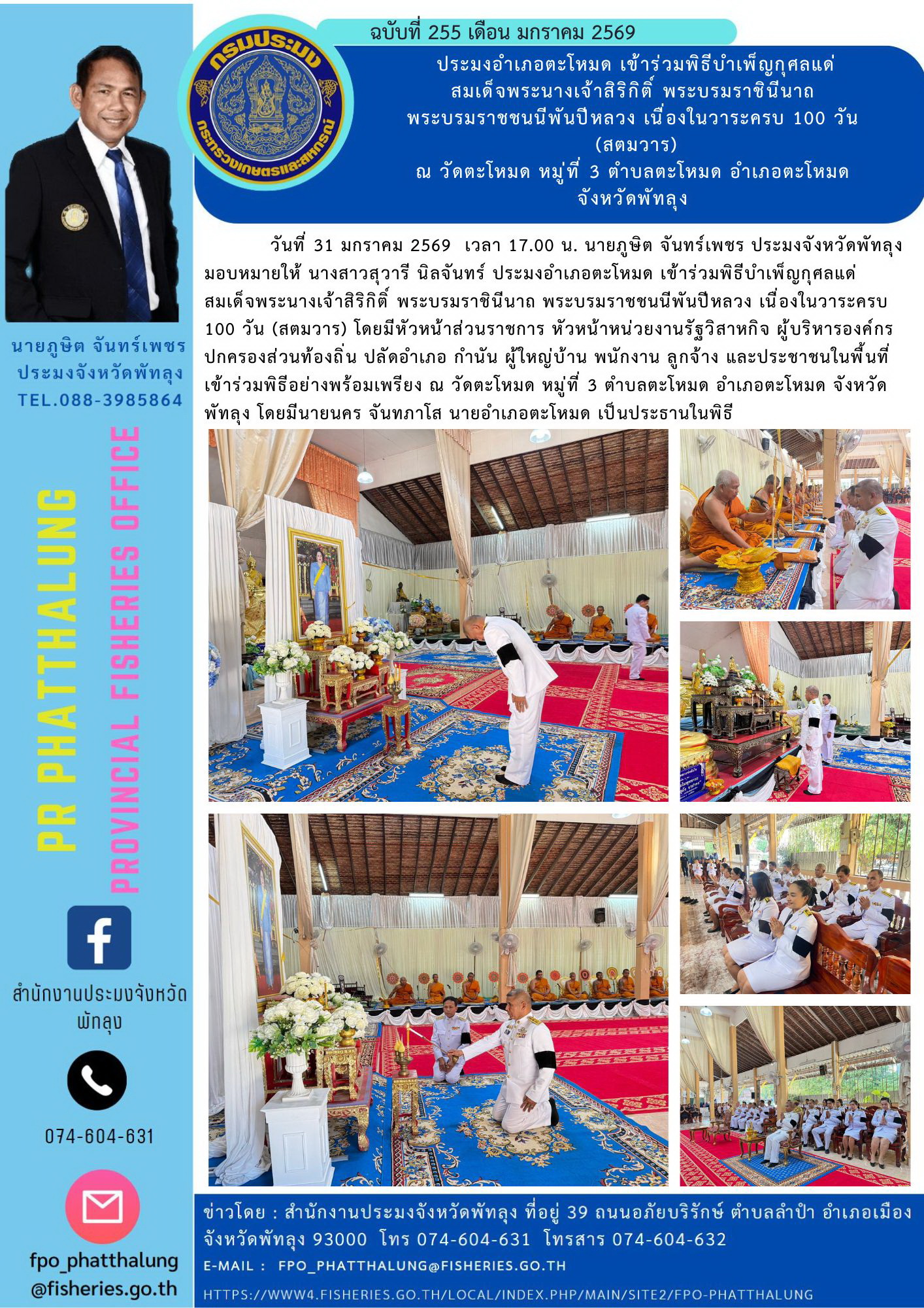 วันที่ 31 มกราคม 2569 เวลา 17.00 น. นายภูษิต จันทร์เพชร ประมงจังหวัดพัทลุง มอบหมายให้ นางสาวสุวารี นิลจันทร์ ประมงอำเภอตะโหมด เข้าร่วมพิธีบำเพ็ญกุศลแด่ สมเด็จพระนางเจ้าสิริกิติ์ พระบรมราชินีนาถ พระบรมราชชนนีพันปีหลวง เนื่องในวาระครบ 100 วัน (สตมวาร) โดยมีหัวหน้าส่วนราชการ หัวหน้าหน่วยงานรัฐวิสาหกิจ ผู้บริหารองค์กรปกครองส่วนท้องถิ่น ปลัดอำเภอ กำนัน ผู้ใหญ่บ้าน พนักงาน ลูกจ้าง และประชาชนในพื้นที่ เข้าร่วมพิธีอย่างพร้อมเพรียง ณ วัดตะโหมด หมู่ที่ 3 ตำบลตะโหมด อำเภอตะโหมด จังหวัดพัทลุง โดยมีนายนคร จันทภาโส นายอำเภอตะโหมด เป็นประธานในพิธี