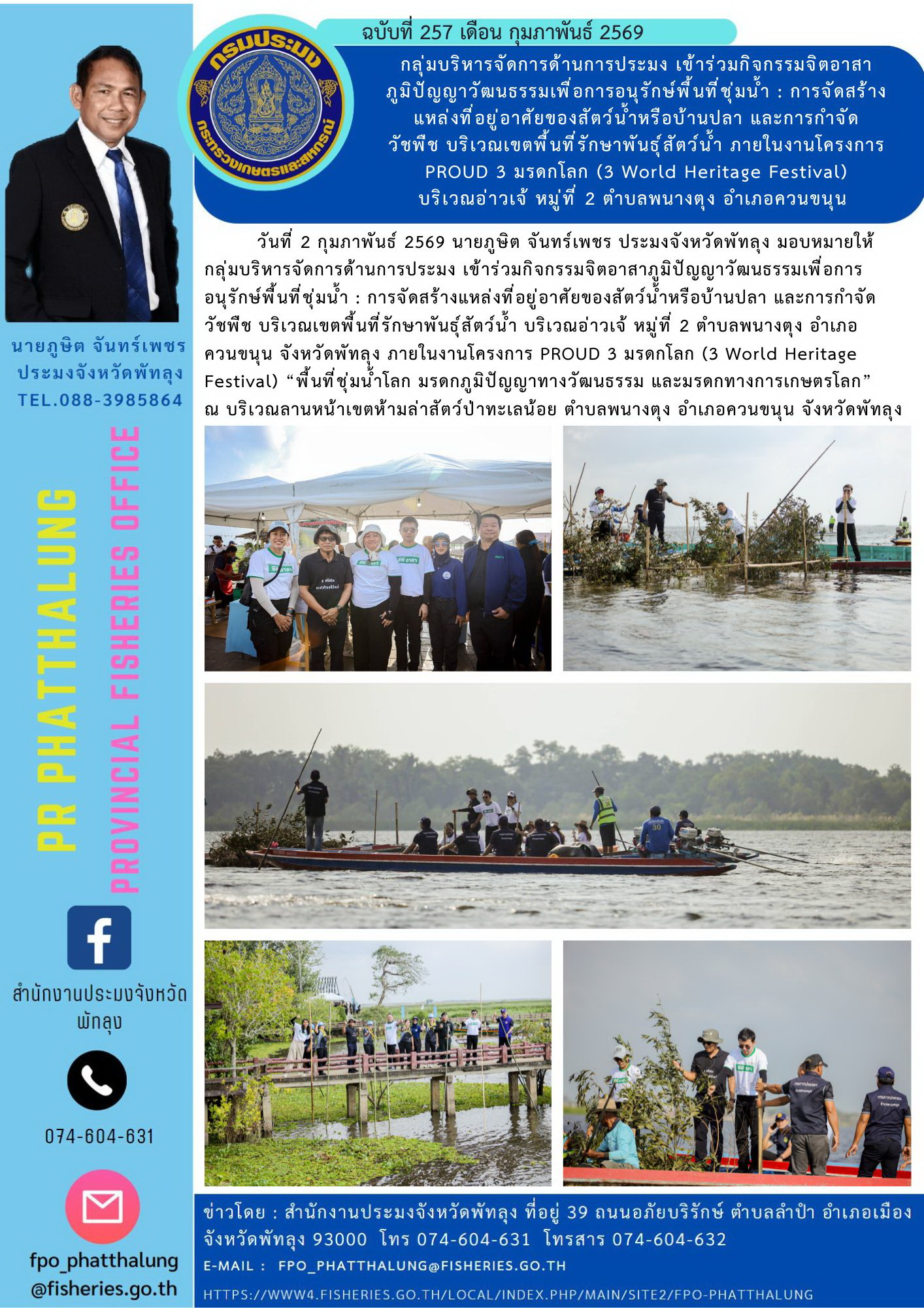วันที่ 2 กุมภาพันธ์ 2569 นายภูษิต จันทร์เพชร ประมงจังหวัดพัทลุง มอบหมายให้ กลุ่มบริหารจัดการด้านการประมง เข้าร่วมกิจกรรมจิตอาสาภูมิปัญญาวัฒนธรรมเพื่อการอนุรักษ์พื้นที่ชุ่มน้ำ : การจัดสร้างแหล่งที่อยู่อาศัยของสัตว์น้ำหรือบ้านปลา และการกำจัดวัชพืช บริเวณเขตพื้นที่รักษาพันธุ์สัตว์น้ำ บริเวณอ่าวเจ้ หมู่ที่ 2 ตำบลพนางตุง อำเภอควนขนุน จังหวัดพัทลุง ภายในงานโครงการ PROUD 3 มรดกโลก (3 World Heritage Festival) “พื้นที่ชุ่มน้ำโลก มรดกภูมิปัญญาทางวัฒนธรรม และมรดกทางการเกษตรโลก” ณ บริเวณลานหน้าเขตห้ามล่าสัตว์ป่าทะเลน้อย ตำบลพนางตุง อำเภอควนขนุน จังหวัดพัทลุง