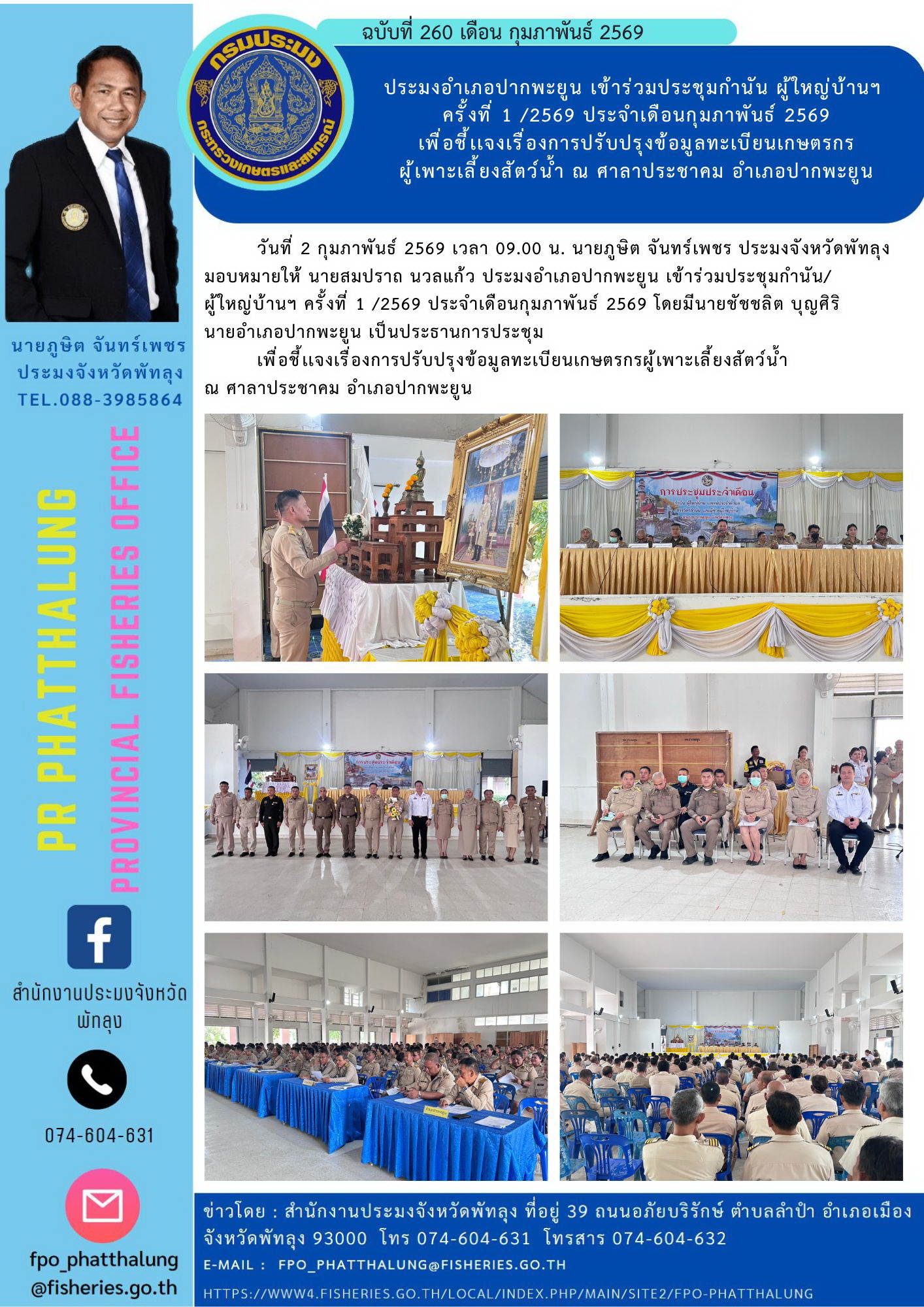 วันที่ 2 กุมภาพันธ์ 2569 เวลา 09.00 น. นายภูษิต จันทร์เพชร ประมงจังหวัดพัทลุง มอบหมายให้ นายถาวร รุกขสุคนธ์ ประมงอำเภอเขาชัยสนเข้าร่วมประชุมกำนัน ผู้ใหญ่บ้าน ผู้ช่วยผู้ใหญ่บ้านแพทย์ประจำตำบล และสารวัตรกำนัน โดยมี นายประยุทธ ทองพุ่ม นายอำเภอเขาชัยสน เป็นประธาน ณ ศาลาประชาคมอำเภอเขาชัยสน จังหวัดพัทลุง ทั้งนี้ ชี้เเจงการปรับปรุงข้อมูลทะเบียนเกษตรกรผู้เพาะเลี้ยงสัตว์น้ำ และ โครงการส่งเสริมอาชีพด้านการประมง เพื่อฟื้นฟูเกษตรกรผู้ประสบอุทกภัยภาคใต้ ปี 2567