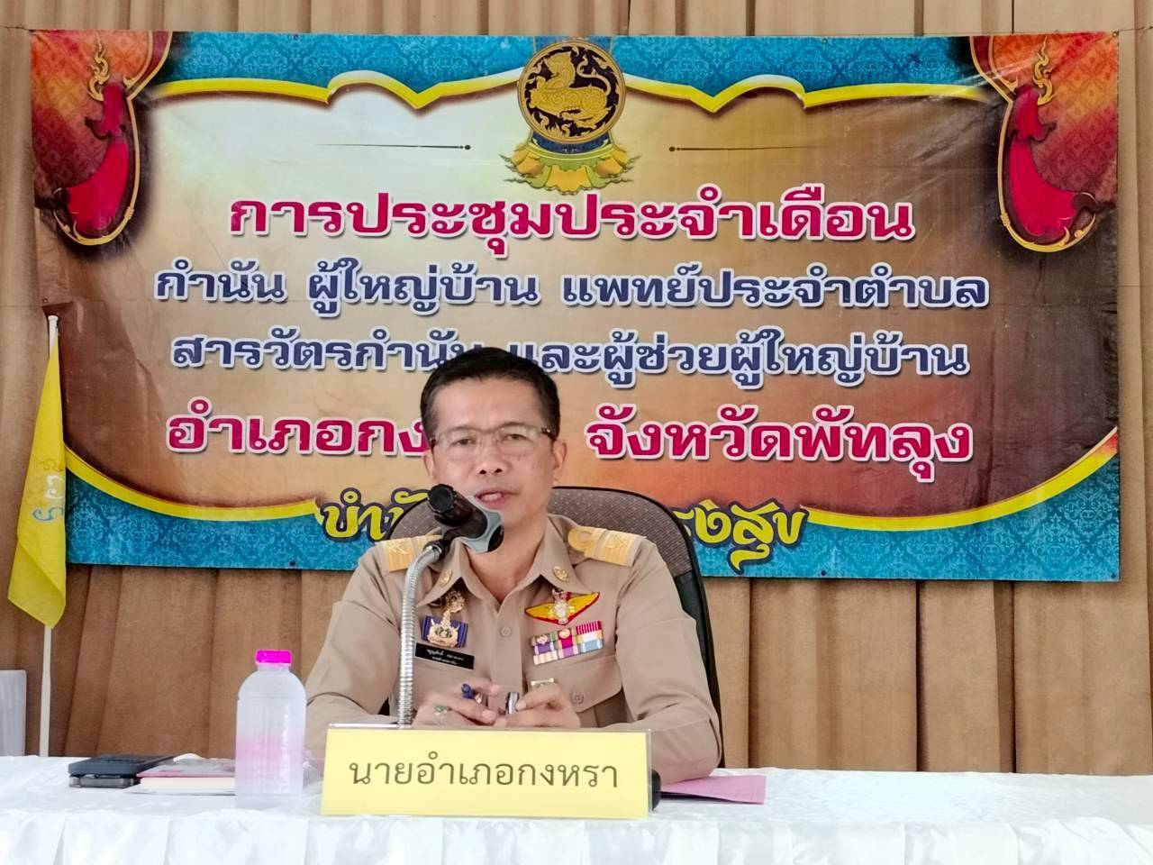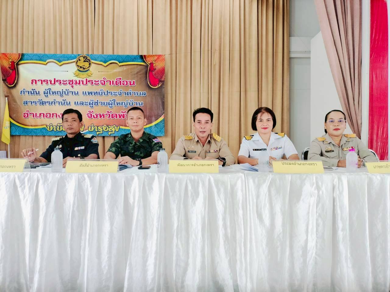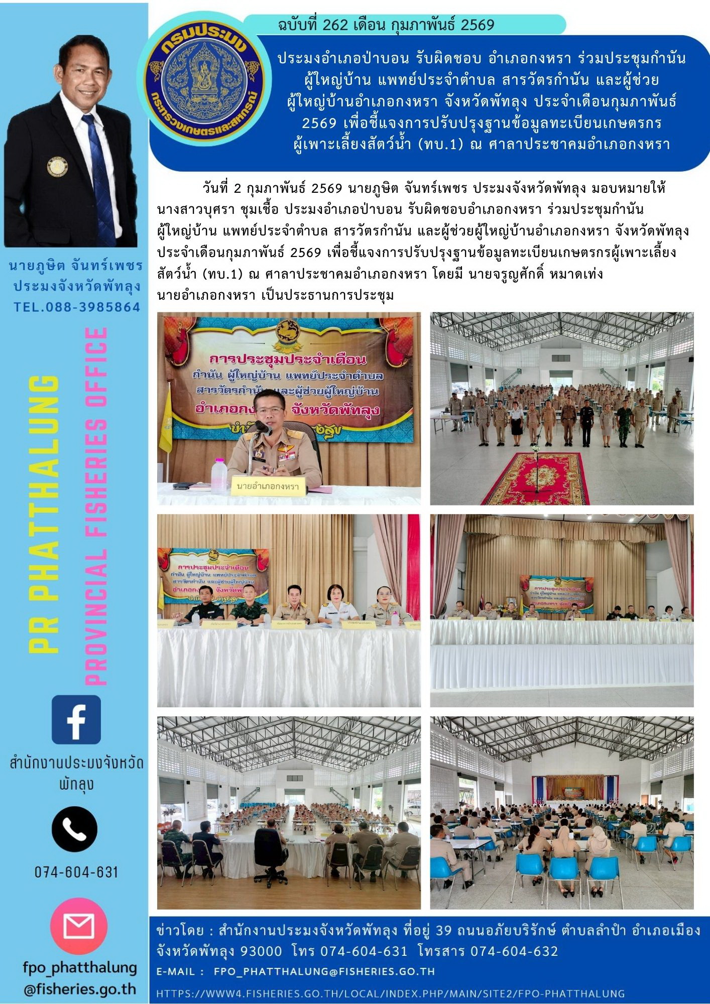 วันที่ 2 กุมภาพันธ์ 2569 นายภูษิต จันทร์เพชร ประมงจังหวัดพัทลุง มอบหมายให้นางสาวบุศรา ชุมเชื้อ ประมงอำเภอป่าบอน รับผิดชอบอำเภอกงหรา ร่วมประชุมกำนันผู้ใหญ่บ้าน แพทย์ประจำตำบล สารวัตรกำนัน และผู้ช่วยผู้ใหญ่บ้านอำเภอกงหรา จังหวัดพัทลุง ประจำเดือนกุมภาพันธ์ 2569 เพื่อชี้แจงการปรับปรุงฐานข้อมูลทะเบียนเกษตรกรผู้เพาะเลี้ยงสัตว์น้ำ (ทบ.1) ณ ศาลาประชาคมอำเภอกงหรา โดยมี นายจรูญศักดิ์ หมาดเท่ง นายอำเภอกงหรา เป็นประธานการประชุม