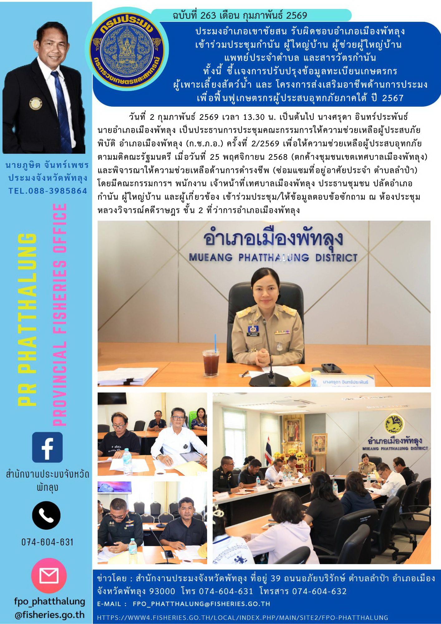วันที่ 2 กุมภาพันธ์ 2569 เวลา 13.30 น. เป็นต้นไป นางศรุดา อินทร์ประพันธ์ นายอำเภอเมืองพัทลุง เป็นประธานการประชุมคณะกรรมการให้ความช่วยเหลือผู้ประสบภัยพิบัติ อำเภอเมืองพัทลุง (ก.ช.ภ.อ.) ครั้งที่ 2/2569 เพื่อให้ความช่วยเหลือผู้ประสบอุทกภัย ตามมติคณะรัฐมนตรี เมื่อวันที่ 25 พฤศจิกายน 2568 (ตกค้างชุมชนเขตเทศบาลเมืองพัทลุง) และพิจารณาให้ความช่วยเหลือด้านการดำรงชีพ (ซ่อมแซมที่อยู่อาศัยประจำ ตำบลลำปำ) โดยมีคณะกรรมการฯ พนักงาน เจ้าหน้าที่เทศบาลเมืองพัทลุง ประธานชุมชน ปลัดอำเภอ กำนัน ผู้ใหญ่บ้าน และผู้เกี่ยวข้อง เข้าร่วมประชุม/ให้ข้อมูลตอบข้อซักถาม ณ ห้องประชุมหลวงวิจารณ์คดีราษฎร ชั้น 2 ที่ว่าการอำเภอเมืองพัทลุง