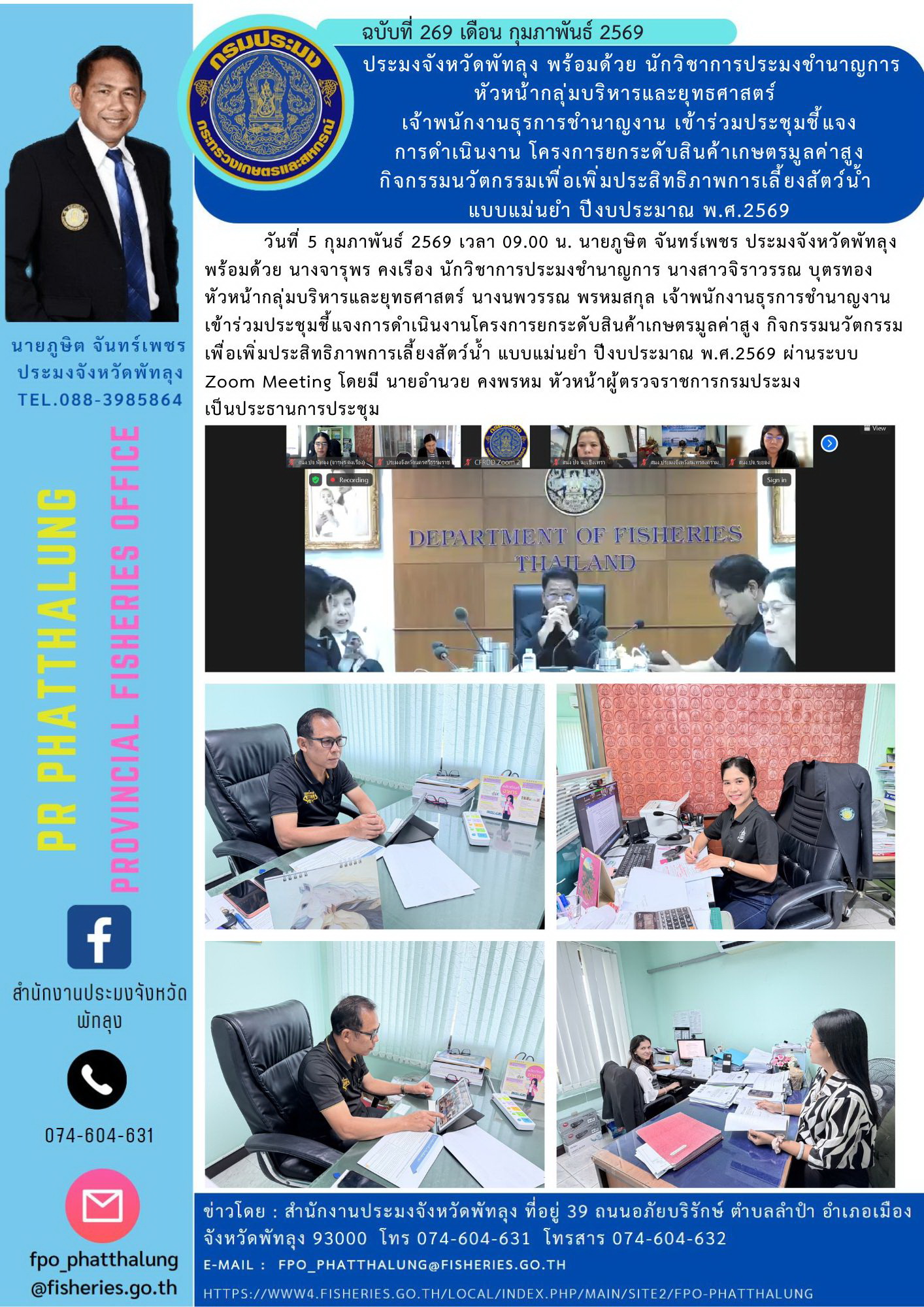 วันที่ 5 กุมภาพันธ์ 2569 เวลา 09.00 น. นายภูษิต จันทร์เพชร ประมงจังหวัดพัทลุง พร้อมด้วย นางจารุพร คงเรือง นักวิชาการประมงชำนาญการ นางสาวจิราวรรณ บุตรทอง หัวหน้ากลุ่มบริหารและยุทธศาสตร์ นางนพวรรณ พรหมสกุล เจ้าพนักงานธุรการชำนาญงานเข้าร่วมประชุมชี้แจงการดำเนินงานโครงการยกระดับสินค้าเกษตรมูลค่าสูง กิจกรรมนวัตกรรมเพื่อเพิ่มประสิทธิภาพการเลี้ยงสัตว์น้ำ แบบแม่นยำ ปีงบประมาณ พ.ศ.2569 ผ่านระบบ Zoom Meeting โดยมี นายอำนวย คงพรหม หัวหน้าผู้ตรวจราชการกรมประมง เป็นประธานการประชุม