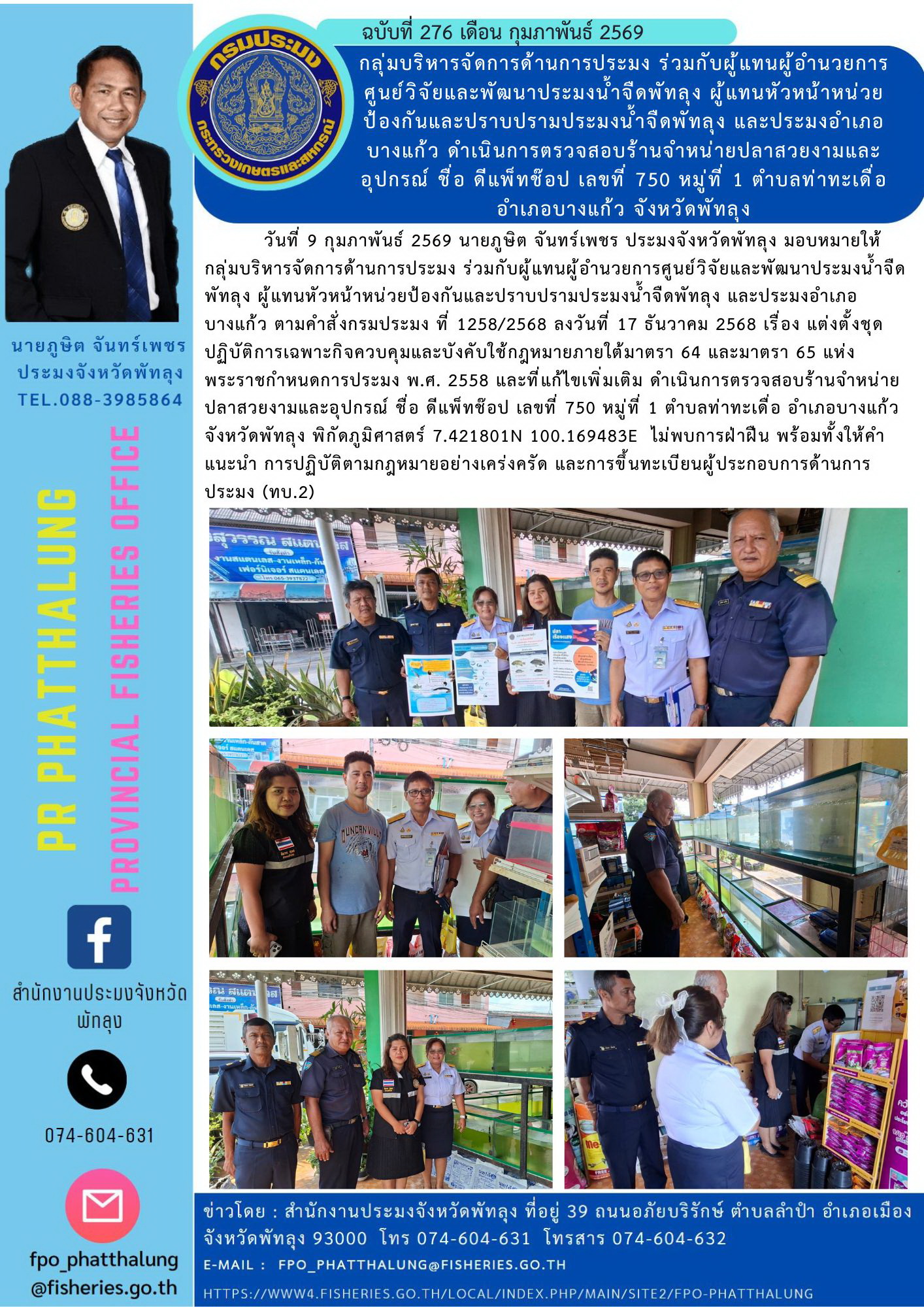 วันที่ 9 กุมภาพันธ์ 2569 นายภูษิต จันทร์เพชร ประมงจังหวัดพัทลุง มอบหมายให้ กลุ่มบริหารจัดการด้านการประมง ร่วมกับผู้แทนผู้อำนวยการศูนย์วิจัยและพัฒนาประมงน้ำจืดพัทลุง ผู้แทนหัวหน้าหน่วยป้องกันและปราบปรามประมงน้ำจืดพัทลุง และประมงอำเภอบางแก้ว ตามคำสั่งกรมประมง ที่ 1258/2568 ลงวันที่ 17 ธันวาคม 2568 เรื่อง แต่งตั้งชุดปฏิบัติการเฉพาะกิจควบคุมและบังคับใช้กฎหมายภายใต้มาตรา 64 และมาตรา 65 แห่ง พระราชกำหนดการประมง พ.ศ. 2558 และที่แก้ไขเพิ่มเติม ดำเนินการตรวจสอบร้านจำหน่ายปลาสวยงามและอุปกรณ์ ชื่อ ดีแพ็ทช๊อป เลขที่ 750 หมู่ที่ 1 ตำบลท่าทะเดื่อ อำเภอบางแก้ว จังหวัดพัทลุง พิกัดภูมิศาสตร์ 7.421801N 100.169483E ไม่พบการฝ่าฝืน พร้อมทั้งให้คำแนะนำ การปฏิบัติตามกฎหมายอย่างเคร่งครัด และการขึ้นทะเบียนผู้ประกอบการด้านการประมง (ทบ.2)