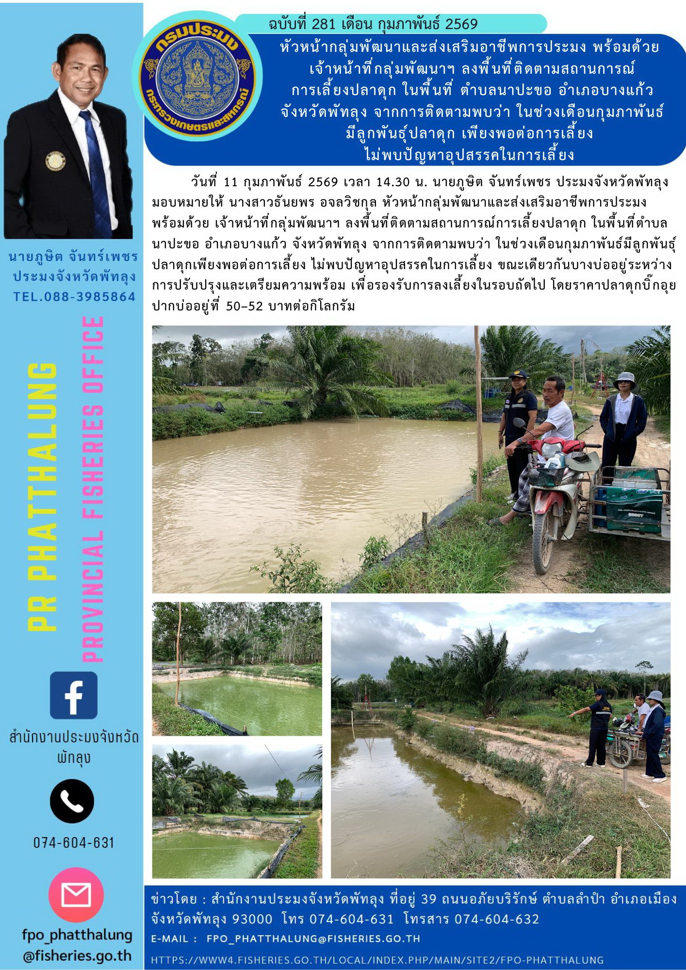 วันที่ 11 กุมภาพันธ์ 2569 เวลา 14.30 น. นายภูษิต จันทร์เพชร ประมงจังหวัดพัทลุง มอบหมายให้ นางสาวธันยพร อจลวิชกุล หัวหน้ากลุ่มพัฒนาและส่งเสริมอาชีพการประมง พร้อมด้วย เจ้าหน้าที่กลุ่มพัฒนาฯ ลงพื้นที่ติดตามสถานการณ์การเลี้ยงปลาดุก ในพื้นที่ตำบลนาปะขอ อำเภอบางแก้ว จังหวัดพัทลุง จากการติดตามพบว่า ในช่วงเดือนกุมภาพันธ์มีลูกพันธุ์ปลาดุกเพียงพอต่อการเลี้ยง ไม่พบปัญหาอุปสรรคในการเลี้ยง ขณะเดียวกันบางบ่ออยู่ระหว่างการปรับปรุงและเตรียมความพร้อม เพื่อรองรับการลงเลี้ยงในรอบถัดไป โดยราคาปลาดุกบิ๊กอุยปากบ่ออยู่ที่ 50–52 บาทต่อกิโลกรัม