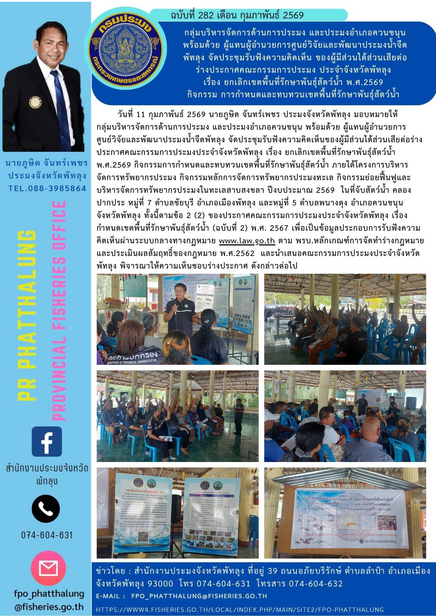 วันที่ 11 กุมภาพันธ์ 2569 นายภูษิต จันทร์เพชร ประมงจังหวัดพัทลุง มอบหมายให้ กลุ่มบริหารจัดการด้านการประมง และประมงอำเภอควนขนุน พร้อมด้วย ผู้แทนผู้อำนวยการ ศูนย์วิจัยและพัฒนาประมงน้ำจืดพัทลุง จัดประชุมรับฟังความคิดเห็นของผู้มีส่วนได้ส่วนเสียต่อร่างประกาศคณะกรรมการประมงประจำจังหวัดพัทลุง เรื่อง ยกเลิกเขตพื้นที่รักษาพันธุ์สัตว์น้ำ พ.ศ.2569 กิจกรรมการกำหนดและทบทวนเขตพื้นที่รักษาพันธุ์สัตว์น้ำ ภายใต้โครงการบริหารจัดการทรัพยากรประมง กิจกรรมหลักการจัดการทรัพยากรประมงทะเล กิจกรรมย่อยฟื้นฟูและบริหารจัดการทรัพยากรประมงในทะเลสาบสงขลา ปีงบประมาณ 2569 ในที่จับสัตว์น้ำ คลองปากประ หมู่ที่ 7 ตำบลชัยบุรี อำเภอเมืองพัทลุง และหมู่ที่ 5 ตำบลพนางตุง อำเภอควนขนุน จังหวัดพัทลุง ทั้งนี้ตามข้อ 2 (2) ของประกาศคณะกรรมการประมงประจำจังหวัดพัทลุง เรื่อง กำหนดเขตพื้นที่รักษาพันธุ์สัตว์น้ำ (ฉบับที่ 2) พ.ศ. 2567 เพื่อเป็นข้อมูลประกอบการรับฟังความคิดเห็นผ่านระบบกลางทางกฏหมาย www.law.go.th ตาม พรบ.หลักเกณฑ์การจัดทำร่างกฎหมายและประเมินผลสัมฤทธิ์ของกฎหมาย พ.ศ.2562 และนำเสนอคณะกรรมการประมงประจำจังหวัดพัทลุง พิจารณาให้ความเห็นชอบร่างประกาศ ดังกล่าวต่อไป