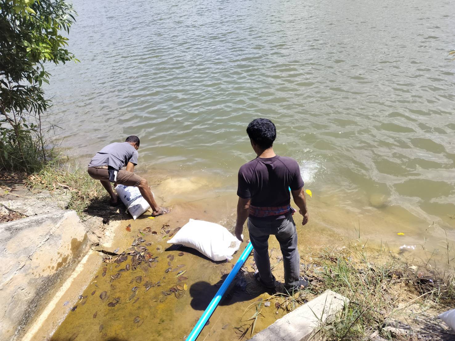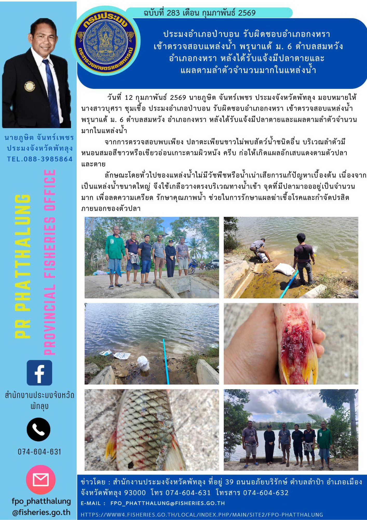 ประมงอำเภอป่าบอน รับผิดชอบอำเภอกงหรา เข้าตรวจสอบแหล่งน้ำ พรุนาแด้ ม. 6 ตำบลสมหวัง อำเภอกงหรา หลังได้รับแจ้งมีปลาตายและ แผลตามลำตัวจำนวนมากในแหล่งน้ำ