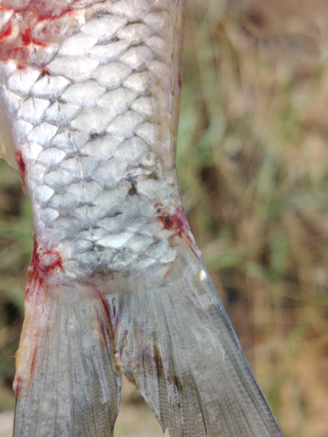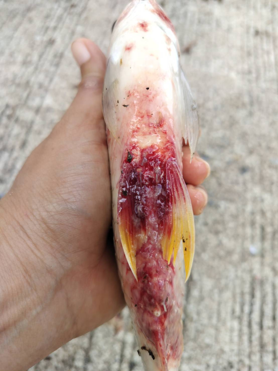พรุนาแด้ ม.6 ตำบลสมหวัง อำเภอกงหรา หลังได้รับแจ้งมีปลาตายและแผลตามลำตัวจำนวนมากในแหล่งน้ำ จากการตรวจสอบพบเพียง ปลาตะเพียนขาวไม่พบสัตว์น้ำชนิดอื่น บริเวณลำตัวมีหนอนสมอสีขาวหรือเขียวอ่อนเกาะตามผิวหนัง ครีบ ก่อให้เกิดแผลอักเสบแดงตามตัวปลา