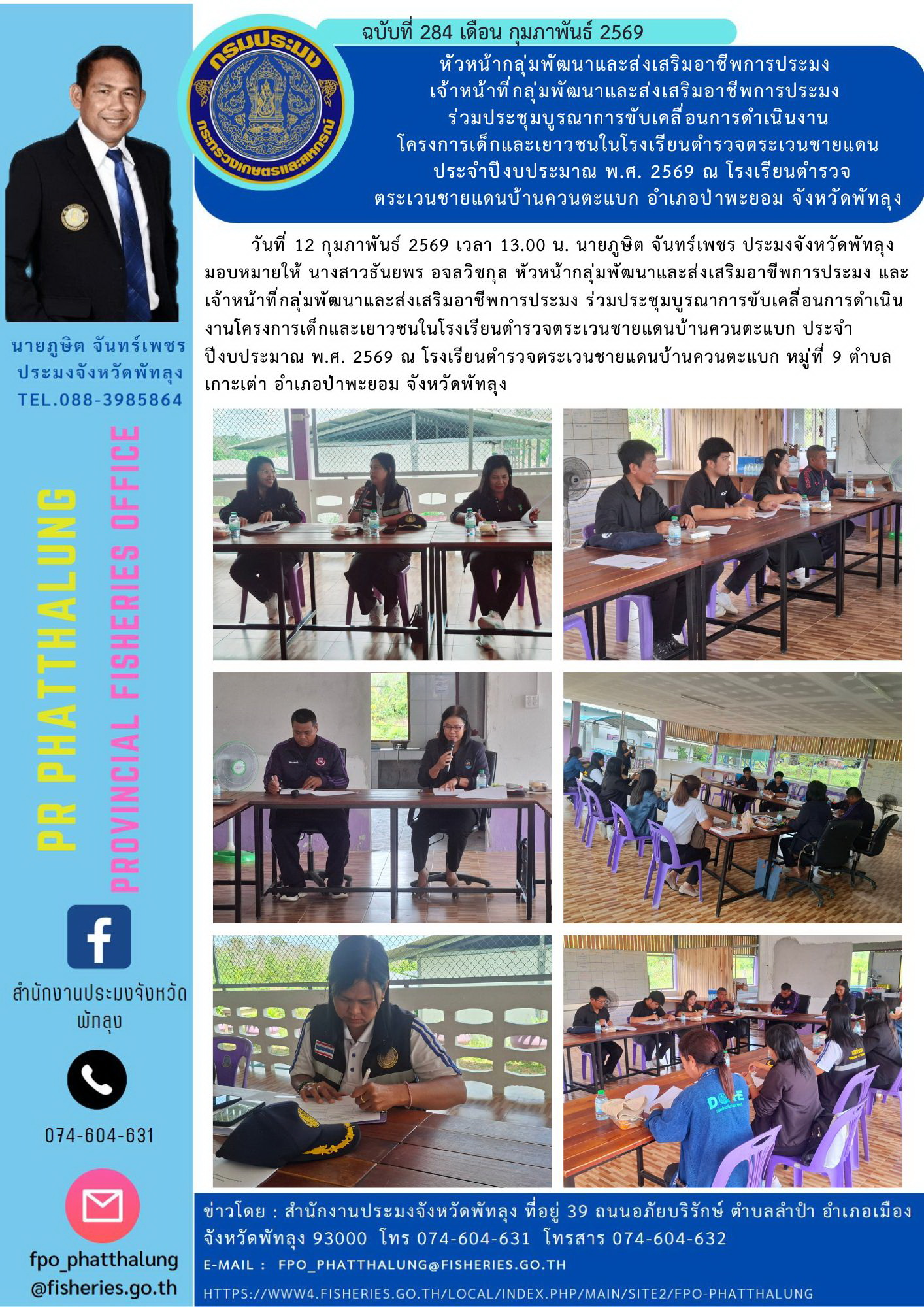 หัวหน้ากลุ่มพัฒนาและส่งเสริมอาชีพการประมง เจ้าหน้าที่กลุ่มพัฒนาและส่งเสริมอาชีพการประมง ร่วมประชุมบูรณาการขับเคลื่อนการดำเนินงาน โครงการเด็กและเยาวชนในโรงเรียนตำรวจตระเวนชายแดน ประจำปีงบประมาณ พ.ศ. 2569 ณ โรงเรียนตำรวจ ตระเวนชายแดนบ้านควนตะแบก อำเภอป่าพะยอม จังหวัดพัทลุง