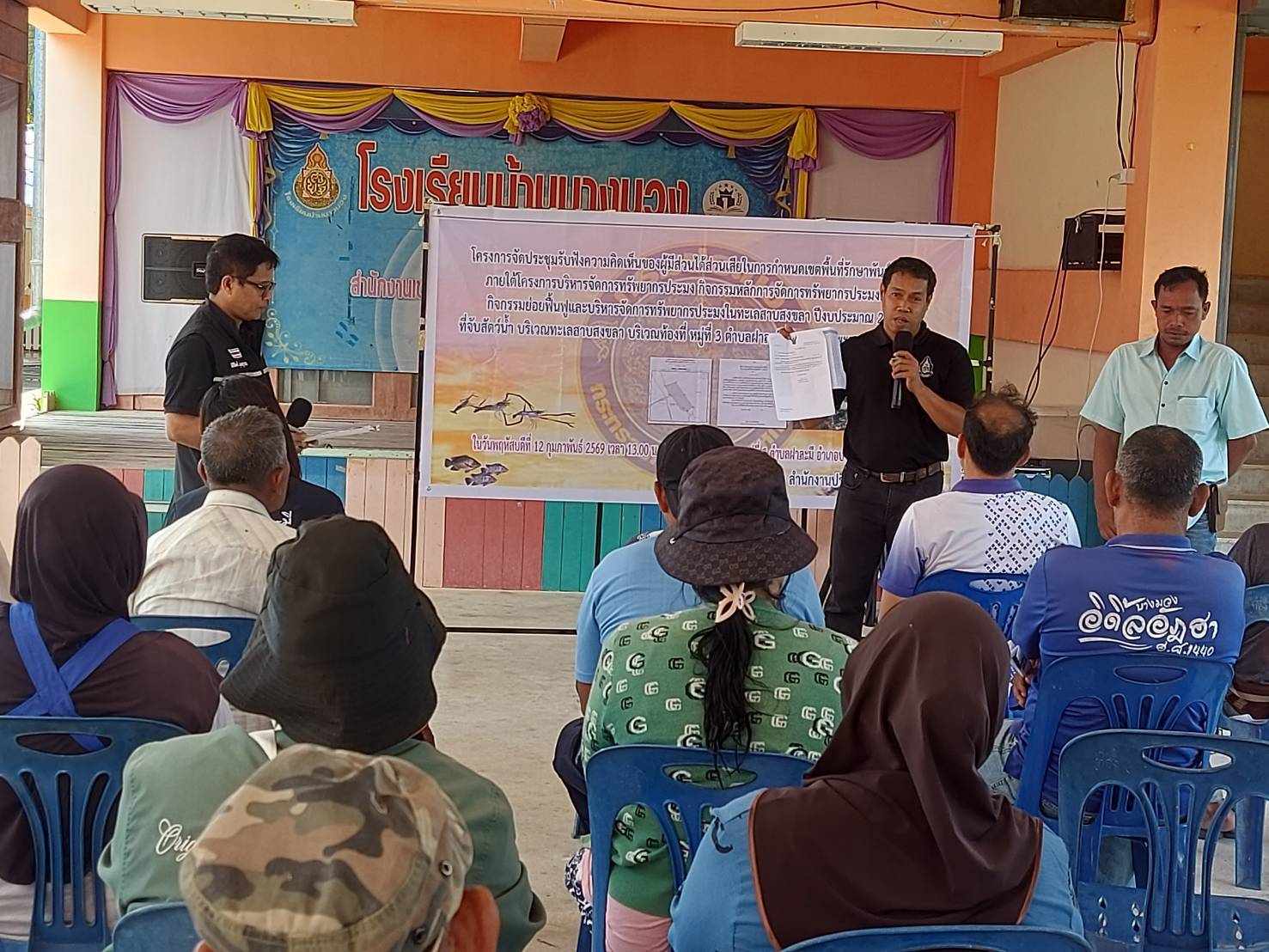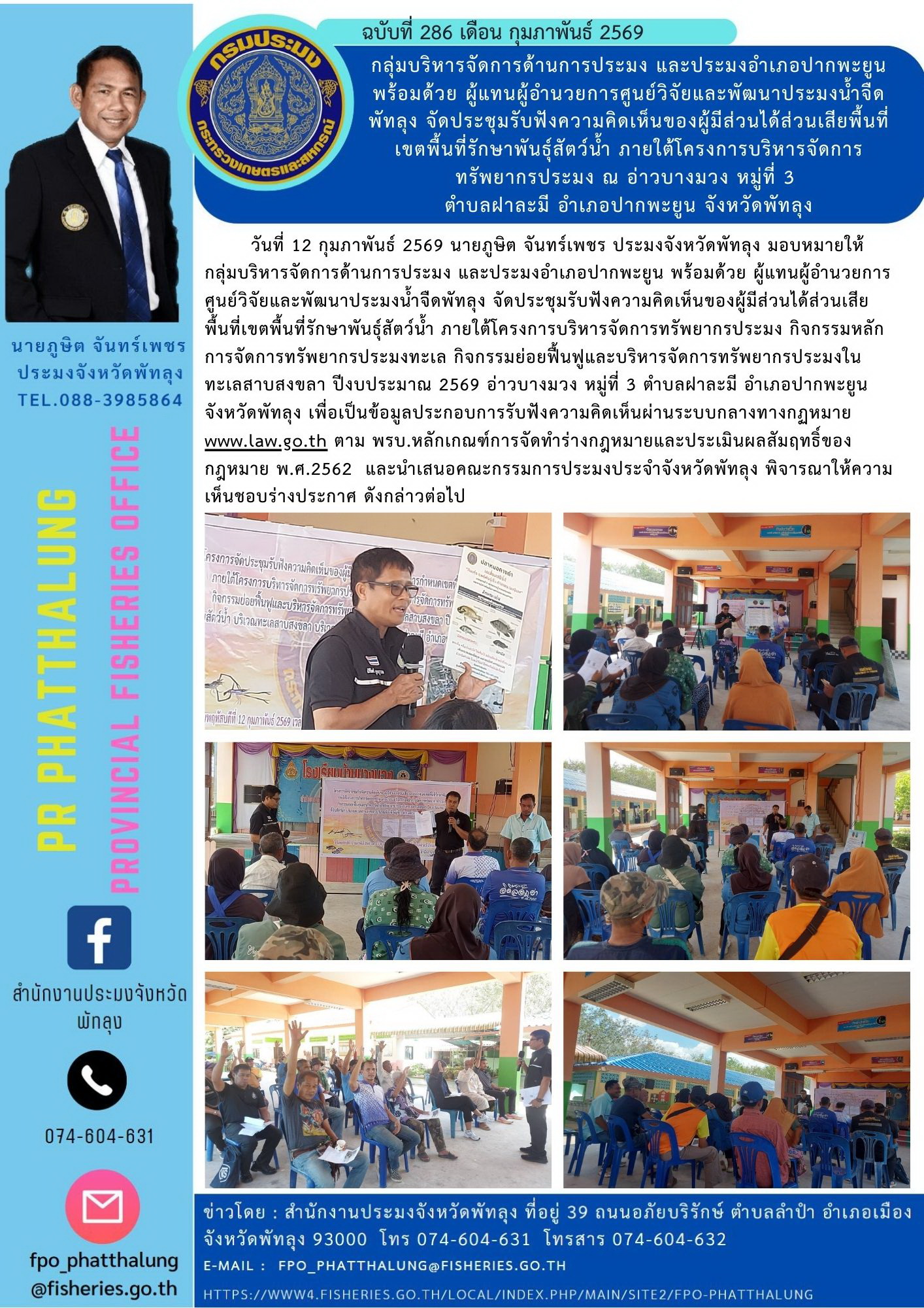 วันที่ 12 กุมภาพันธ์ 2569 นายภูษิต จันทร์เพชร ประมงจังหวัดพัทลุง มอบหมายให้ กลุ่มบริหารจัดการด้านการประมง และประมงอำเภอปากพะยูน พร้อมด้วย ผู้แทนผู้อำนวยการศูนย์วิจัยและพัฒนาประมงน้ำจืดพัทลุง จัดประชุมรับฟังความคิดเห็นของผู้มีส่วนได้ส่วนเสียพื้นที่เขตพื้นที่รักษาพันธุ์สัตว์น้ำ ภายใต้โครงการบริหารจัดการทรัพยากรประมง กิจกรรมหลักการจัดการทรัพยากรประมงทะเล กิจกรรมย่อยฟื้นฟูและบริหารจัดการทรัพยากรประมงในทะเลสาบสงขลา ปีงบประมาณ 2569 อ่าวบางมวง หมู่ที่ 3 ตำบลฝาละมี อำเภอปากพะยูน จังหวัดพัทลุง เพื่อเป็นข้อมูลประกอบการรับฟังความคิดเห็นผ่านระบบกลางทางกฏหมาย www.law.go.th ตาม พรบ.หลักเกณฑ์การจัดทำร่างกฎหมายและประเมินผลสัมฤทธิ์ของกฎหมาย พ.ศ.2562 และนำเสนอคณะกรรมการประมงประจำจังหวัดพัทลุง พิจารณาให้ความเห็นชอบร่างประกาศ ดังกล่าวต่อไป