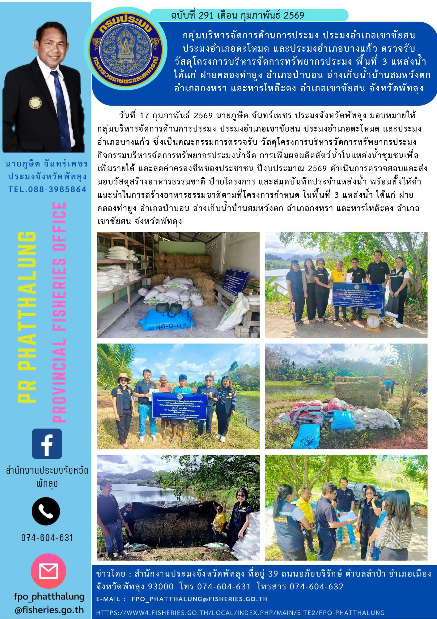 วันที่ 17 กุมภาพันธ์ 2569 นายภูษิต จันทร์เพชร ประมงจังหวัดพัทลุง มอบหมายให้ กลุ่มบริหารจัดการด้านการประมง ประมงอำเภอเขาชัยสน ประมงอำเภอตะโหมด และประมงอำเภอบางแก้ว ซึ่งเป็นคณะกรรมการตรวจรับ วัสดุโครงการบริหารจัดการทรัพยากรประมง กิจกรรมบริหารจัดการทรัพยากรประมงน้ำจืด การเพิ่มผลผลิตสัตว์น้ำในแหล่งน้ำชุมชนเพื่อเพิ่มรายได้ และลดค่าครองชีพของประชาชน ปีงบประมาณ 2569 ดำเนินการตรวจสอบและส่งมอบวัสดุสร้างอาหารธรรมชาติ ป้ายโครงการ และสมุดบันทึกประจำแหล่งน้ำ พร้อมทั้งให้คำแนะนำในการสร้างอาหารธรรมชาติตามที่โครงการกำหนด ในพื้นที่ 3 แหล่งน้ำ ได้แก่ ฝาย คลองท่ายูง อำเภอป่าบอน อ่างเก็บน้ำบ้านสมหวังตก อำเภอกงหรา และหารโหล๊ะตง อำเภอเขาชัยสน จังหวัดพัทลุง